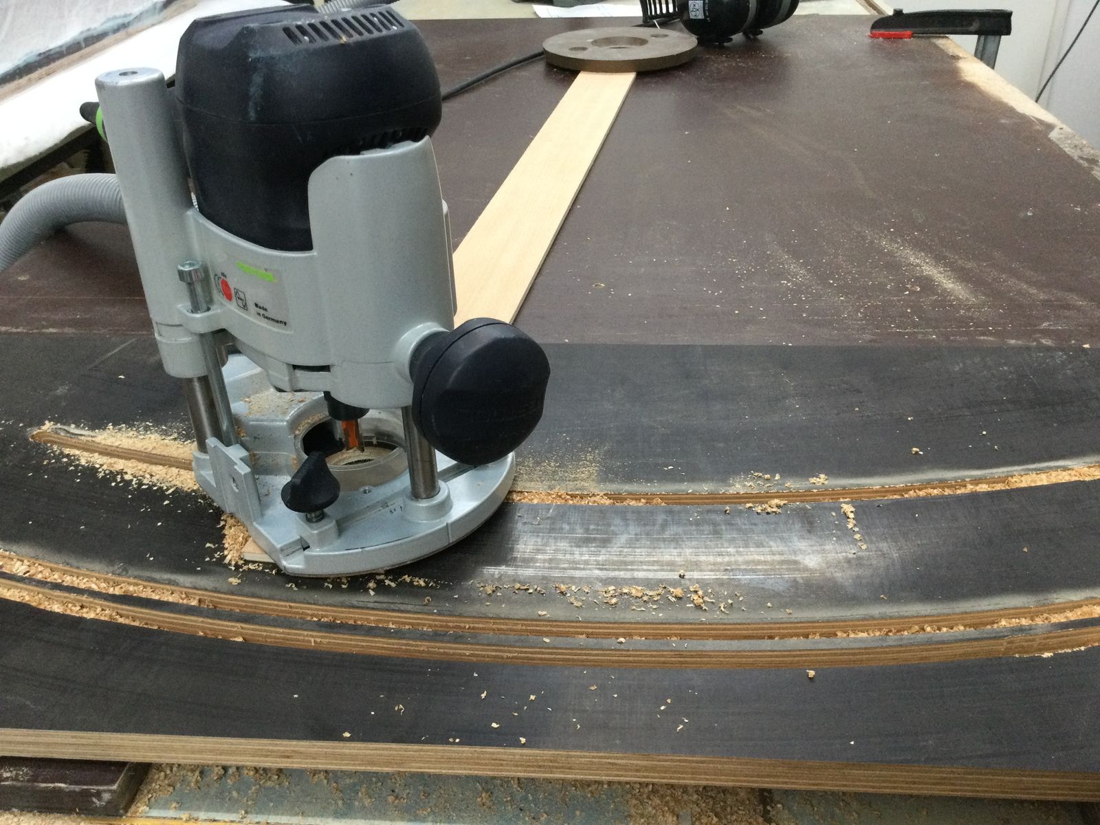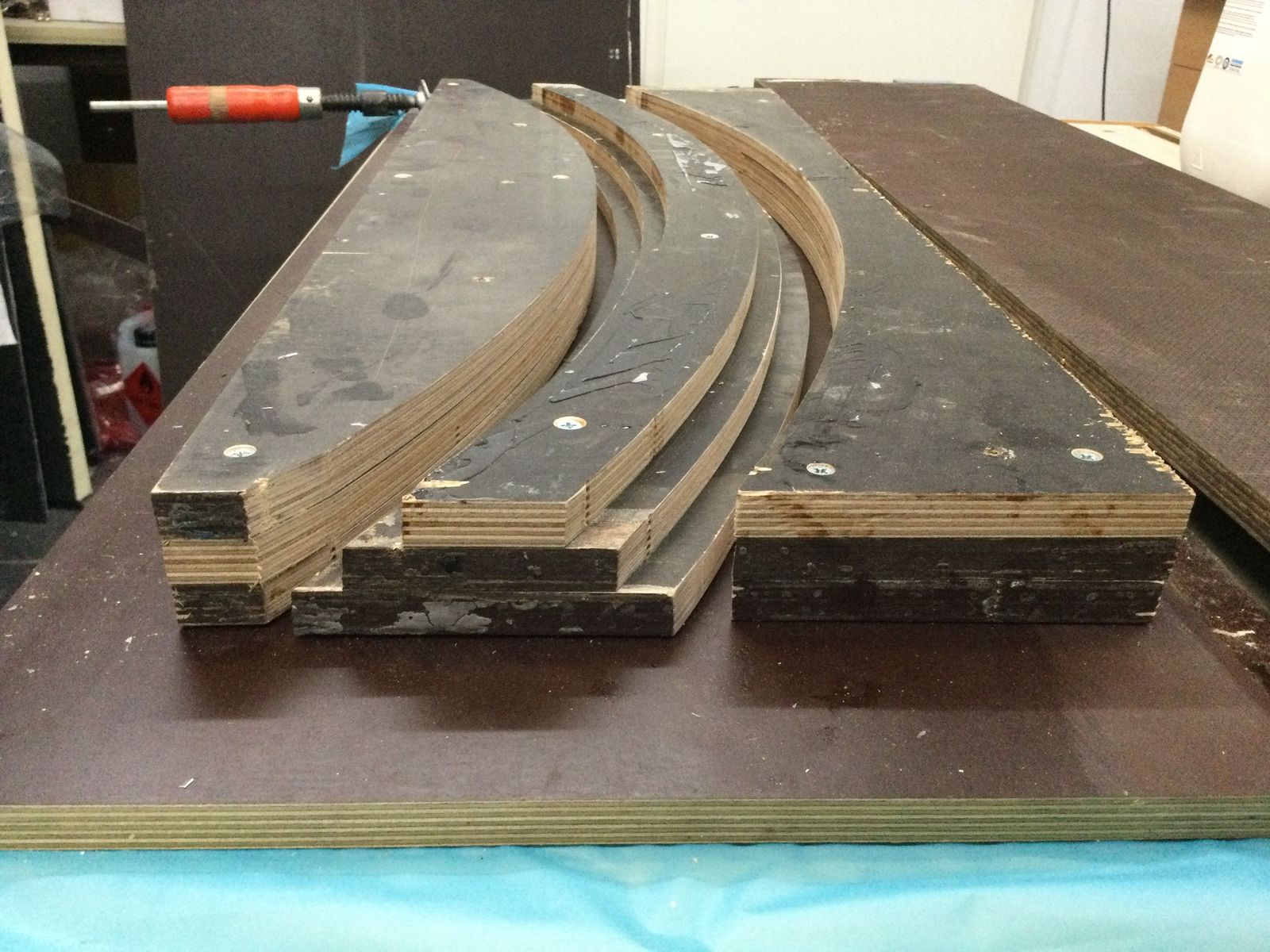 Form aus Siebdruckplatten und Sperrholz gebaut, einseitig laminierte Platten eingesägt...