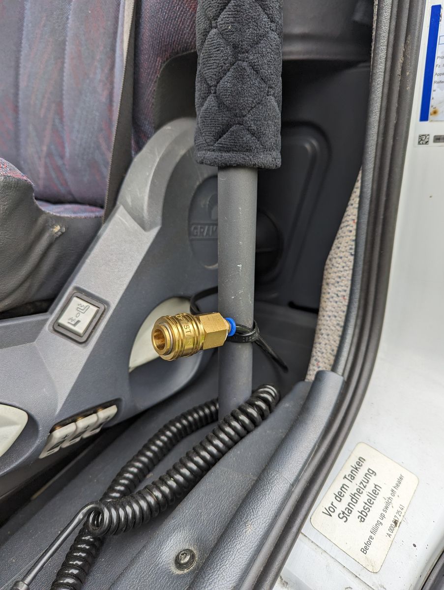 Und da der Fahrersitz auf einmal die Flatteritis bekam, habe ich im Rahmen der Reparatur (Luftschlauch war durchgescheuert) gleich einen Druckluftanschluß zum Reifenbefüllen und Badeente aufpusten eingebaut. Der Defekt trat übrigens während einer kleinen Tour ins Berliner Umland auf. Und da der Atego ja Luftbremsen hat, wurde es recht spannend. Ich musst so auf dem Fahrersitz sitzen, dass möglichst wenig Luft abging - sonst hätten die Bremsen zugemacht. Unverständlich, das es da keine Sicherheitseinrichtung gibt. Der Sitz ist am gleichen Kreis wie die Bremsen.