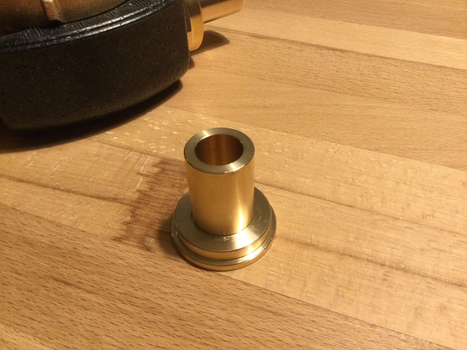 Die vielgepriesenen Vortexpumpen kamen mit 1/2 Zoll Aussengewinde. Viel Bastelei und Gewicht, um auf die Alde-Schläuche zu kommen. Also schnell mal gezeichnet und dem Metallbauer geschickt. War nicht ganz günstig, ~25 € das Stück: