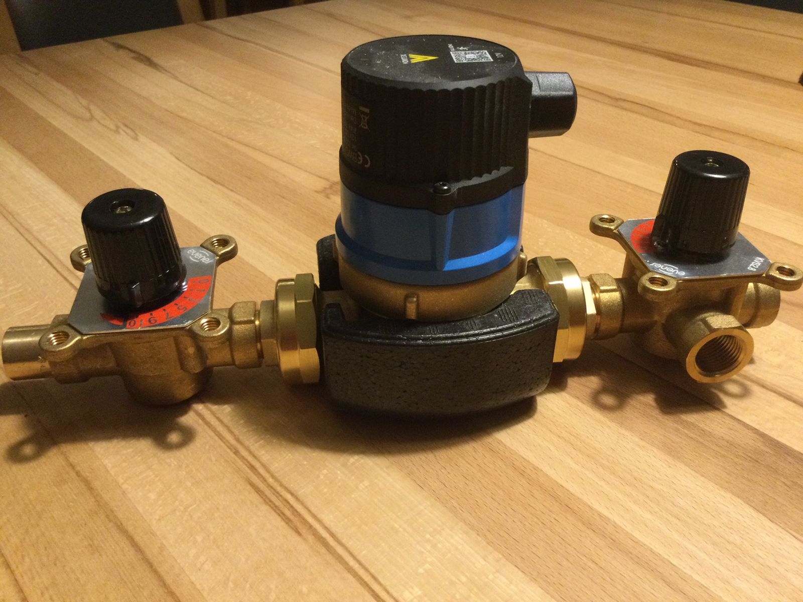 Für die Fussbodenheizung gibt es eine Extrapume mit zwei Mischern. Vorlauf-/Rücklaufwasser in die Pumpe und verteilen auf Fussboden- und Tankheizung.