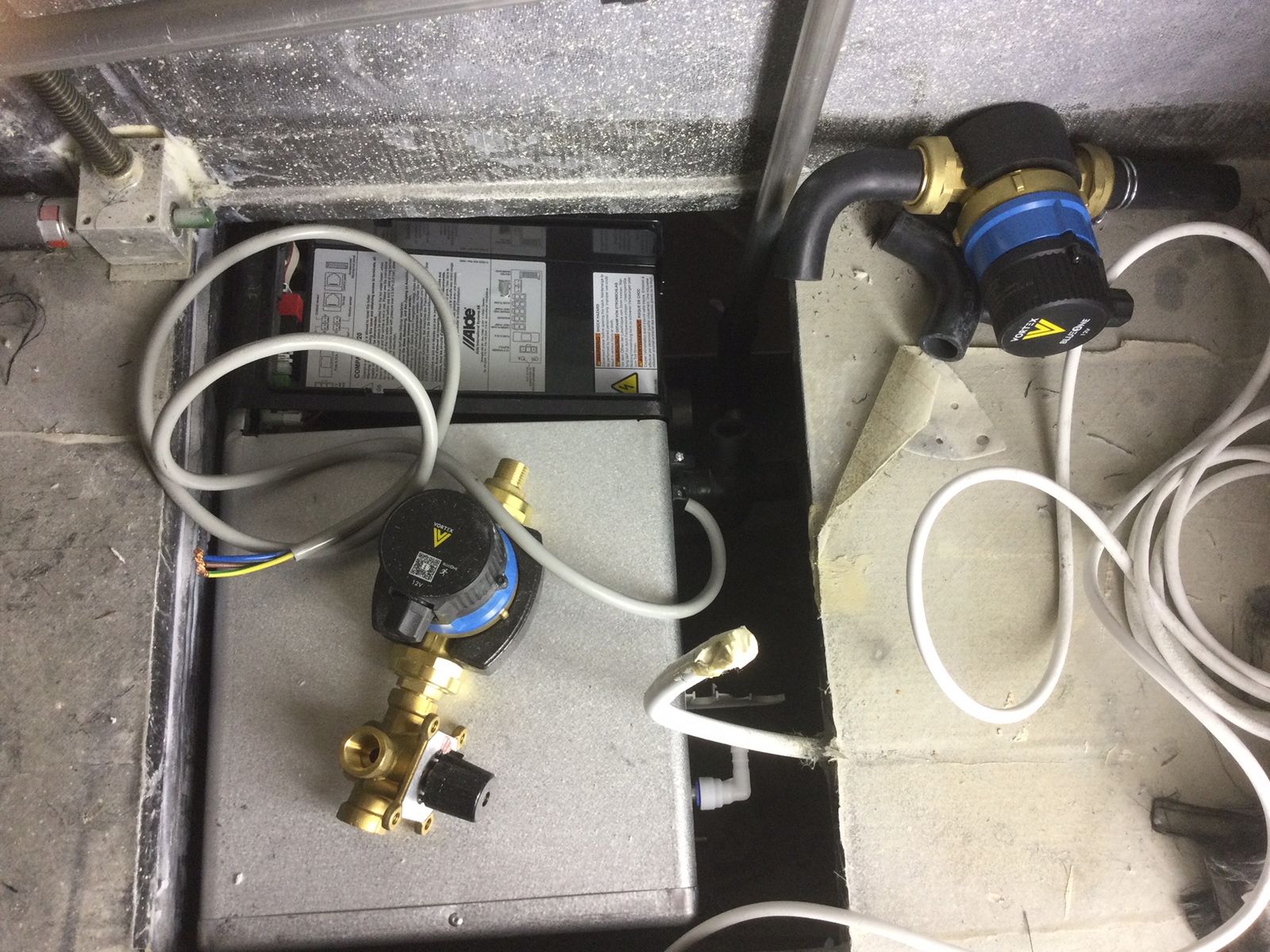 Die Alde-Therme wollte nicht in das vorbereitete Loch passen. Die Anschraublaschen der Heizung mussten weichen. Dann habe ich mangels Vorstellungsvermögen und fehlendem 3D-Programm den Anschluss der Fussbodenheizung so lange nicht geplant, bis ich grübelnd vor der Enge des Einbauraums saß.