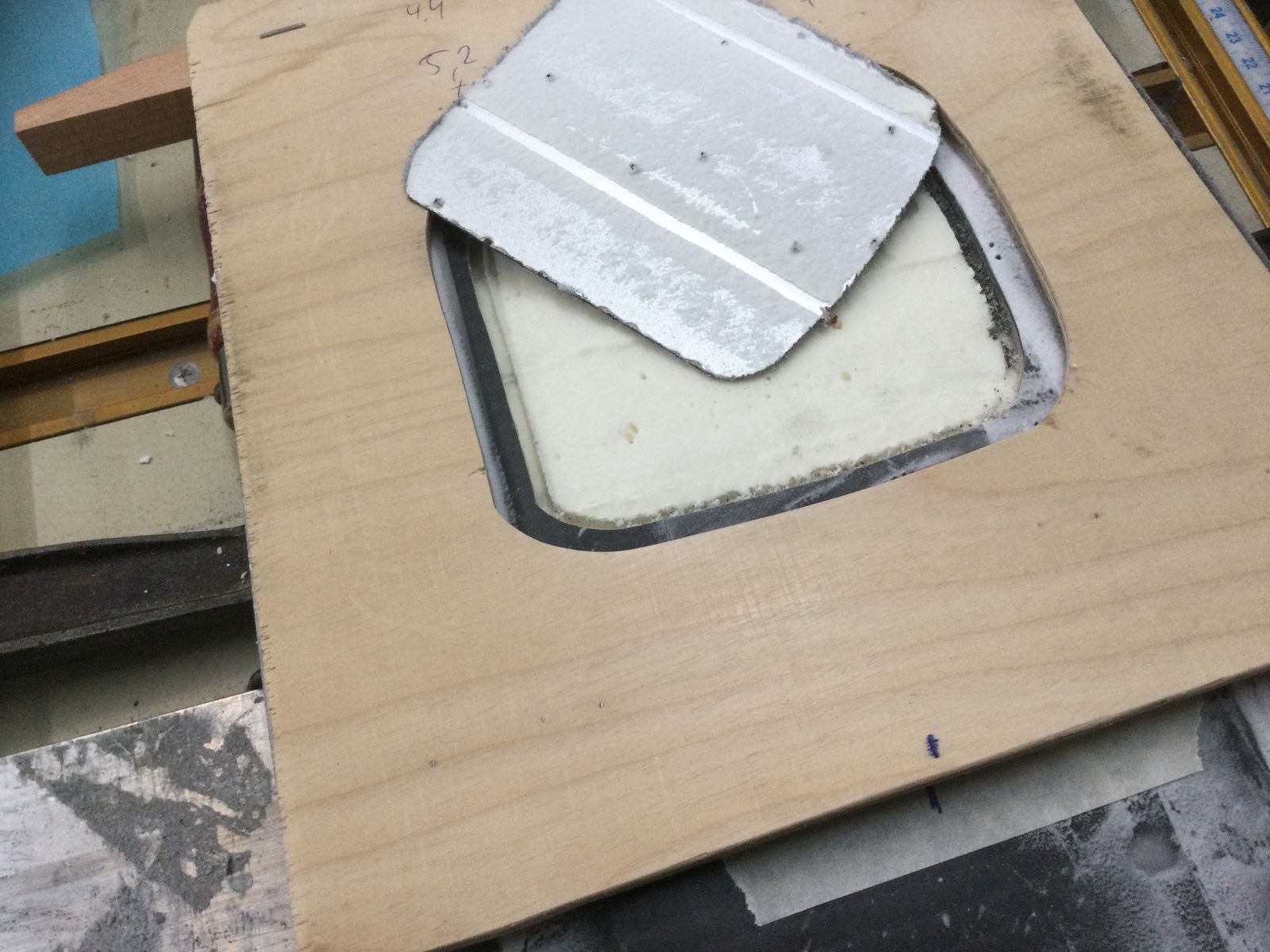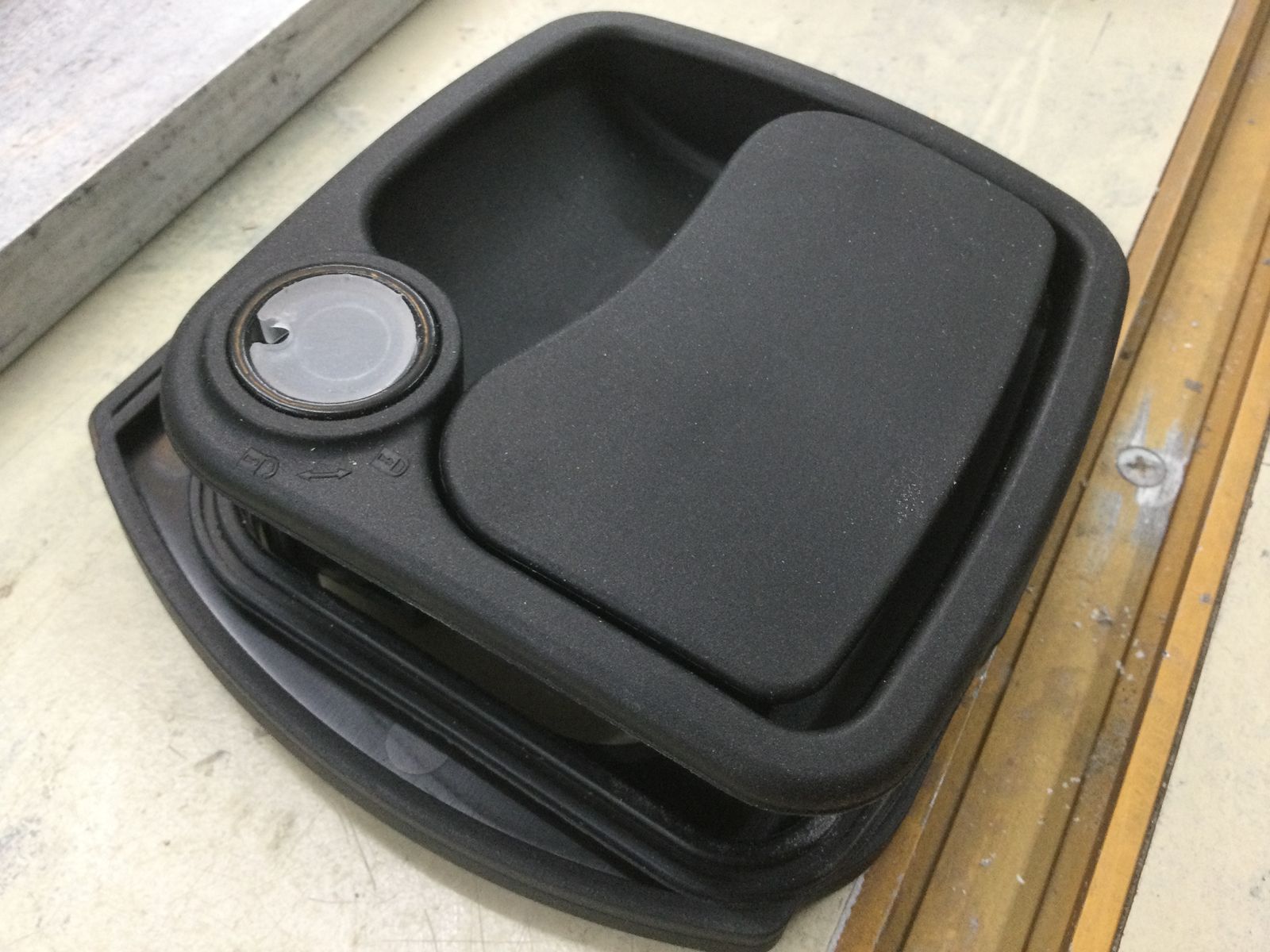 Klebstoff alle, also weiter mit der nächsten Baustelle. Die Fräsungen in die Klappen für die Schliessmechaniken mussten gemacht werden. Der Schliessmechanismus ist für 30 mm Wandstärke gemacht. Die Klappen haben 40 mm, sind jedoch gewölbt. Die Fräsungen schaffen eine gerade Fläche und lassen den Griff bündig in die Platte ein.