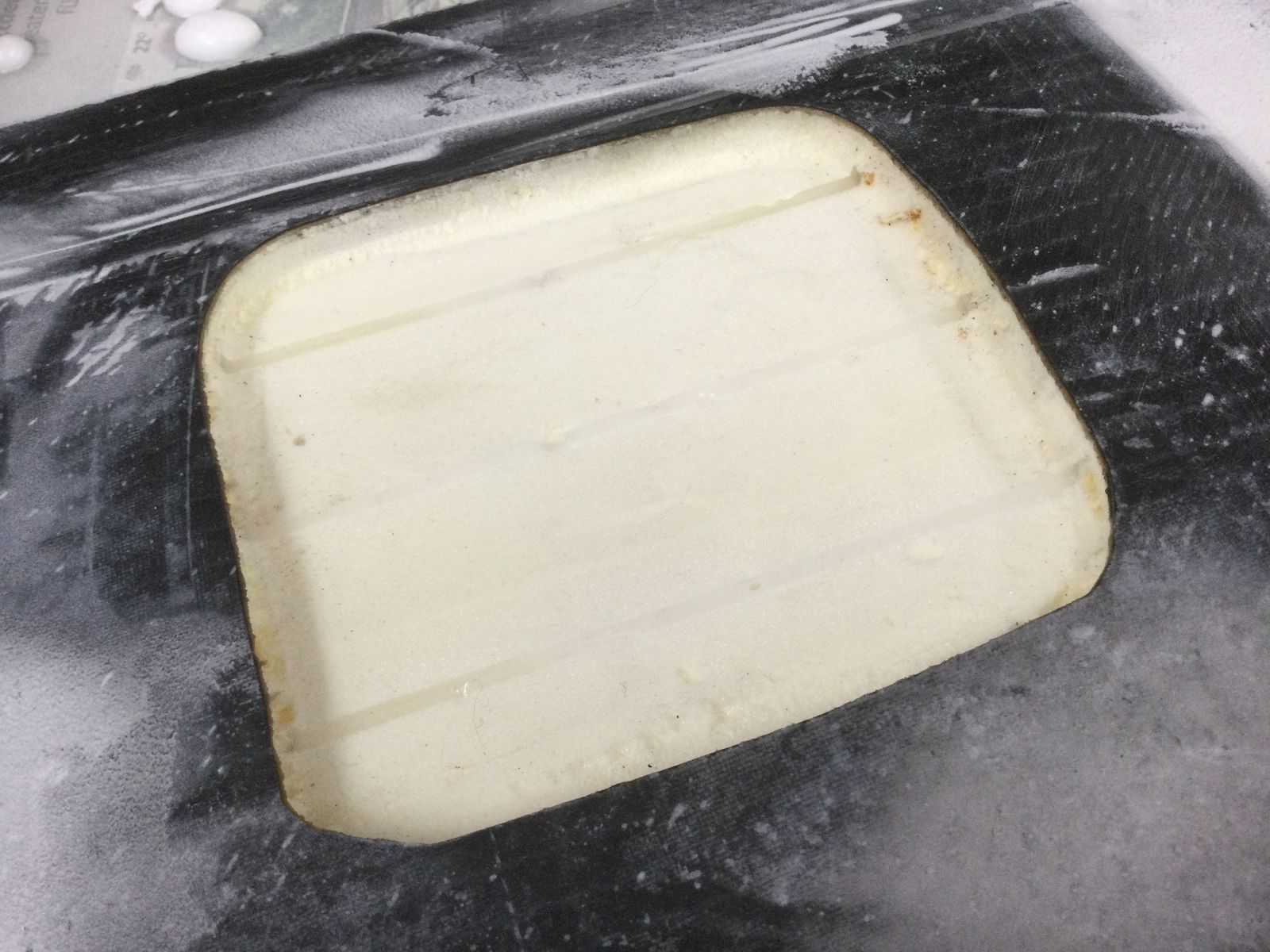 Zuerst wurde mit einem schmalen Fräser und einer Frässchablone die Kohlefaser freigestellt und abgezogen. Die Rückseite der Kohlefaser zeigt, dass das Harz in die Lochungen der Dämmstoffplatte gelaufen ist und damit die Haftung auf der Platte erhöht hat.