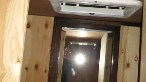 Auf dem Bild mit der geöffneten Spiegeltür sieht man das Heck mit der offenen Dämmung. Der Ausschnitt entspricht dem zukünftigen Heckfenster.