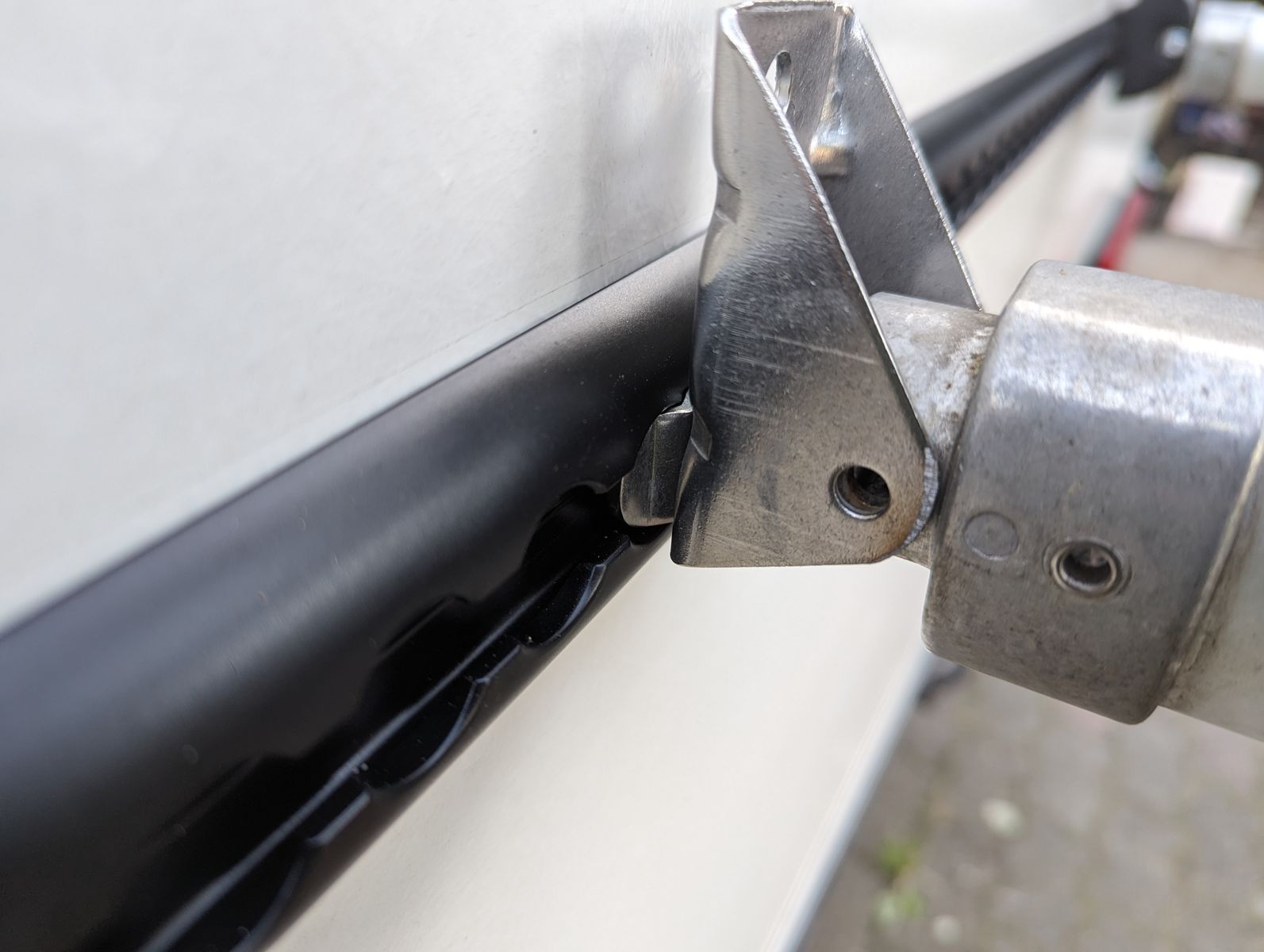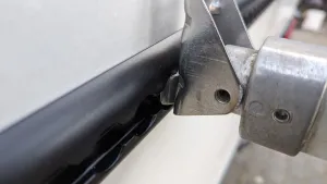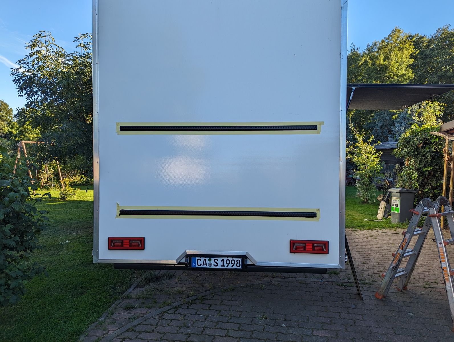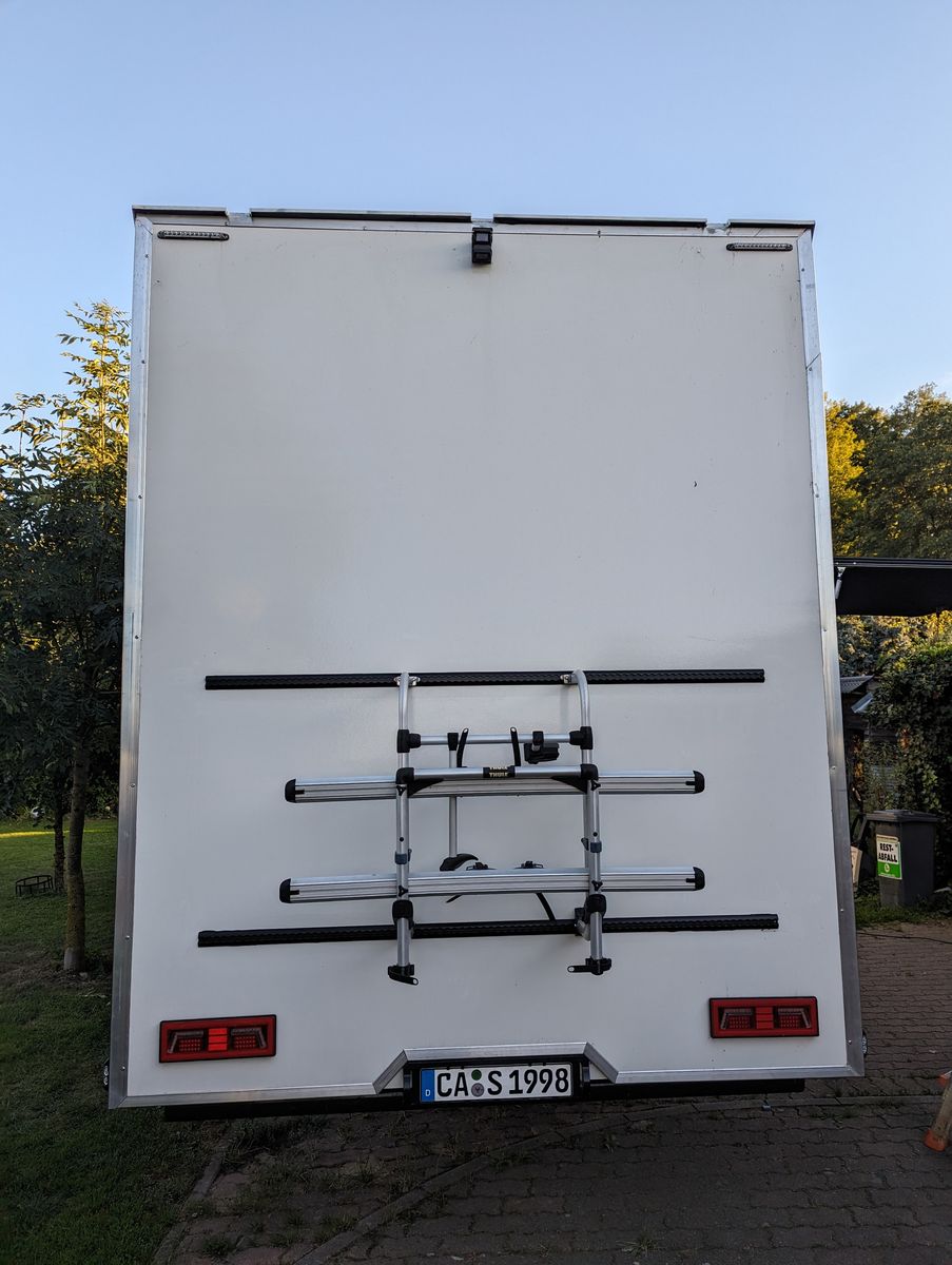 Am Heck sind nun zwei Airlineschienen installiert. Dort hat zunächst ein Fahrradträger Platz genommen. auf der rechten Seite hängen auch zwei "Sandbleche", eigentlich nur zwei Kunststoffgitter für die nasse Wiese. Auf der linken Seite wird noch ein Kanisterhalter für Heizöl angebaut. Ich hab nämlich gemerkt, dass der Heizöltank mit 15l wohl etwas knapp ist. Vielleich kommt da irgendwann etwas Größeres hin, zunächst müssen aber die zwei Blechkanister herhalten. Wird wohl auch recht gut aussehen.
