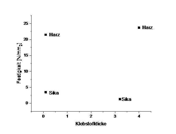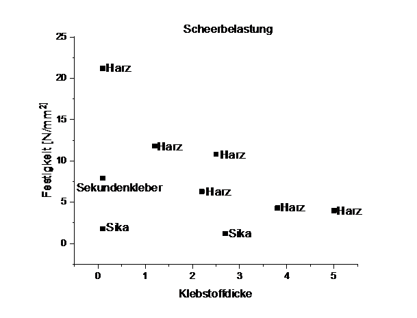 Das Sikaflex liess sich ordentlich in die Länge ziehen, bevor es im Volumen gerissen ist, aber noch an einigen Stellen verbunden war. Das Harz ist fast ohne Längenänderung sofort gebrochen, allerdings bei sehr hohen Festigkeitswerten. Nicht alle Stumpfverbindungen mit Harz konnten getestet werden, weil die Probenaufnahme eigentlich nur für 2500 N ausgelegt ist, wir aber bis 5000 N gezogen haben.