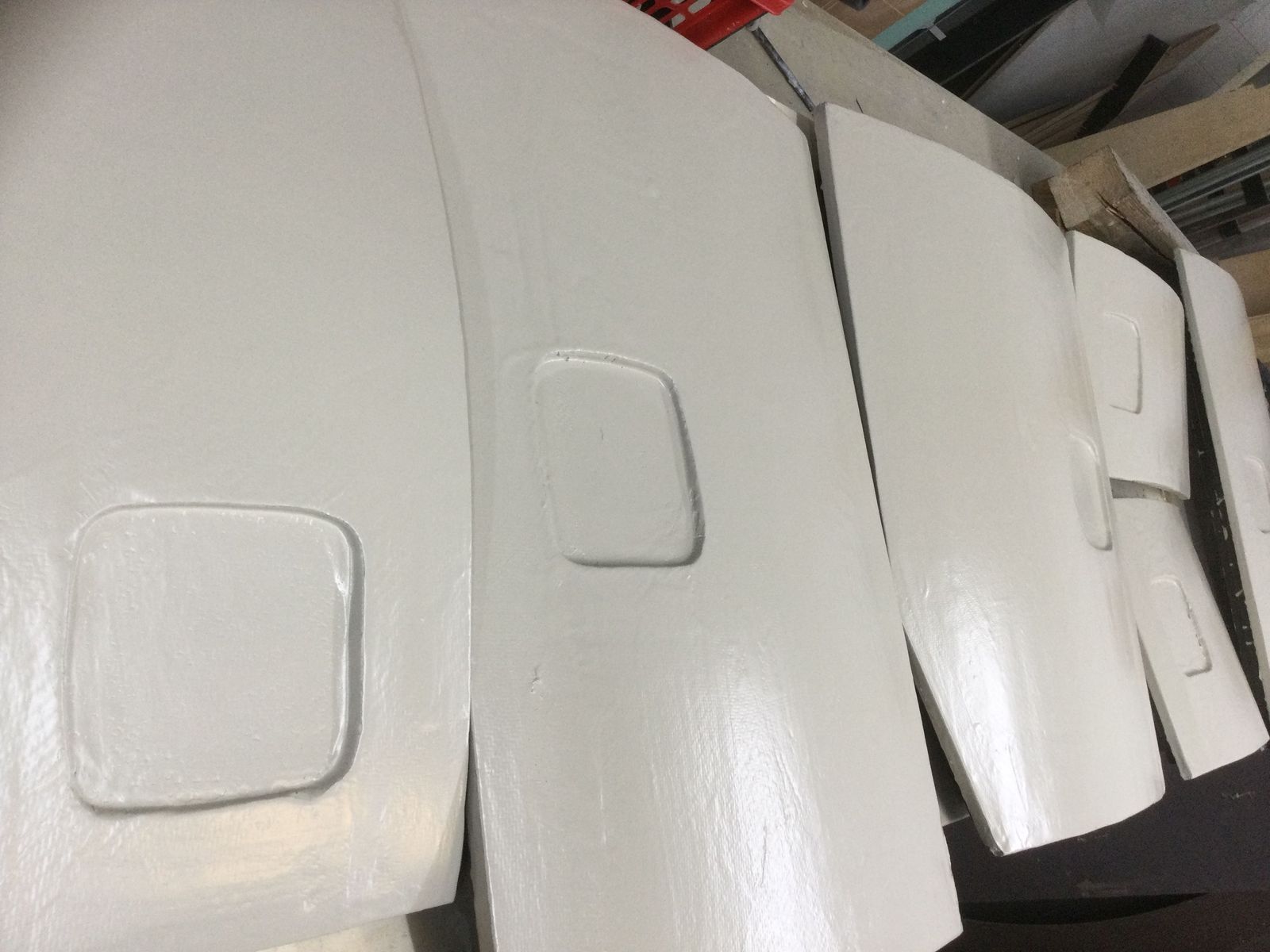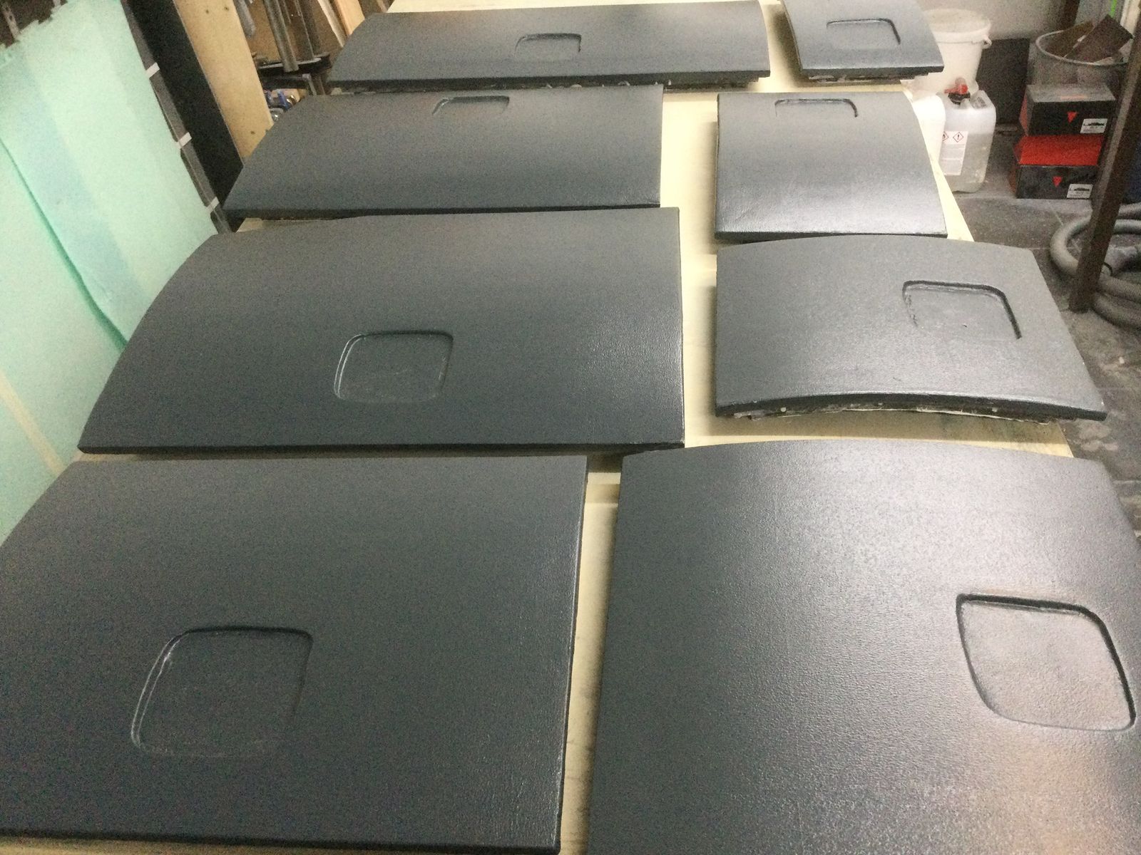 Die 8 Klappen sind von aussen gespachtelt, überlaminiert, mit Grundierung eingepinselt, geschliffen und mit der Rolle lackiert worden.