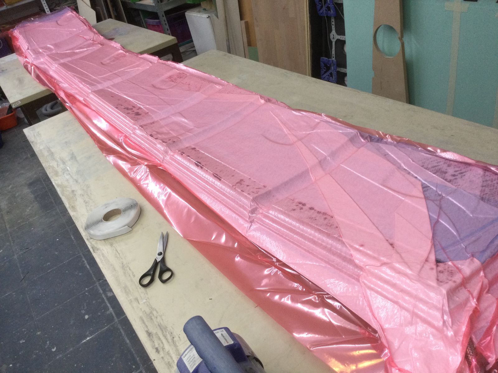 In diesem Jahr habe ich den Zwischenrahmen gebaut und mit dem Fuso sowie der Kabine verheiratet. Lange Zeit habe ich mich mit der gerundeten Seitenverkleidung beschäftigt, gestern die geraden Flächen für die Schlösser auf den Innenseiten der Platten gefräst, eine Lage Kohlefaser aufgeklebt und alle 8 Klappen in einen Vakuumschlauch gesteckt. Ergebnisse sehe ich erst im neuen Jahr.