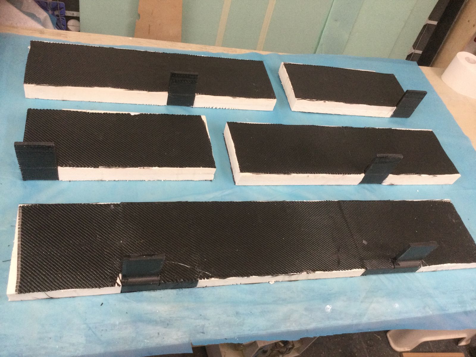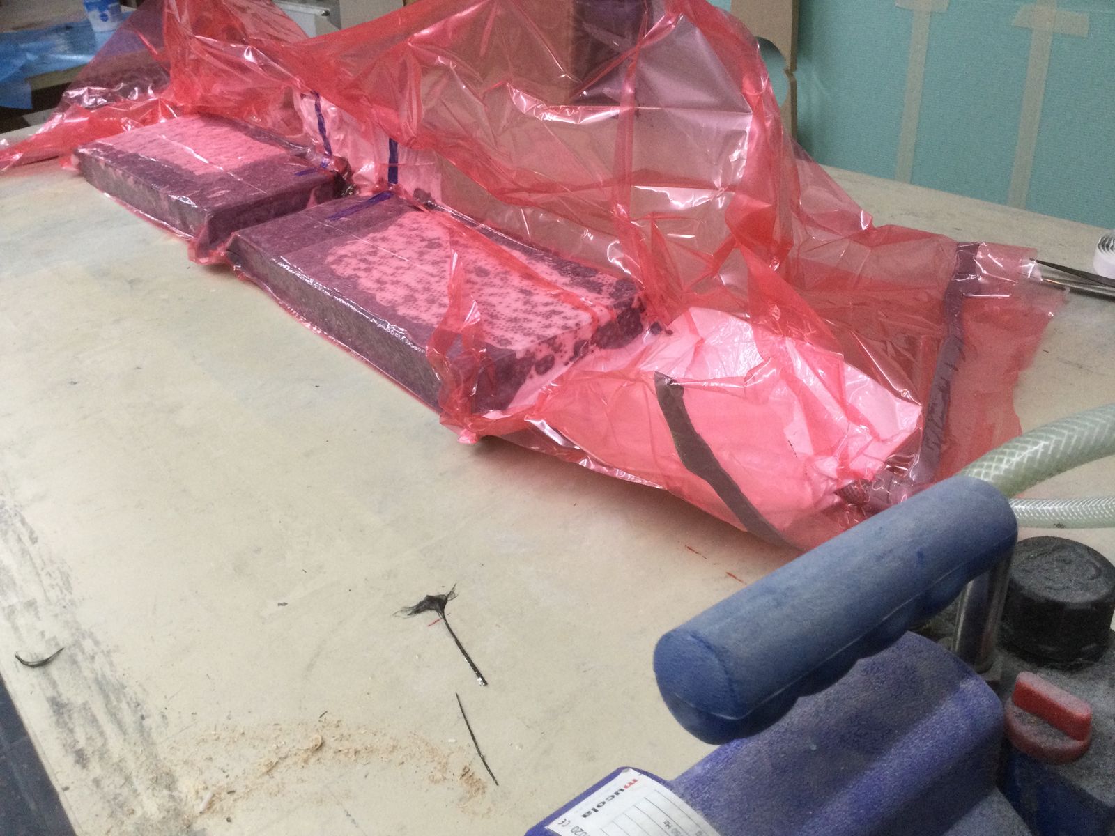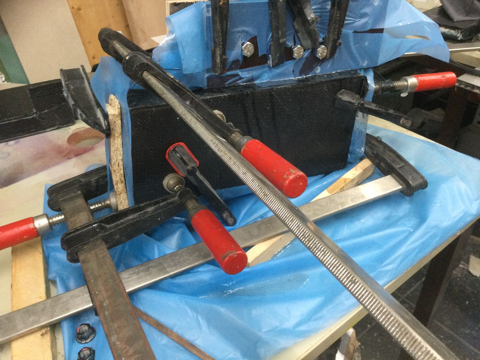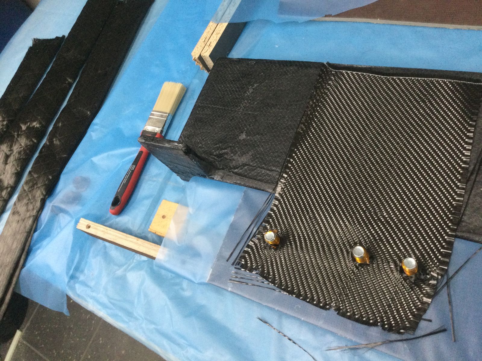Form mit Schraubpunkten für die seitliche Rahmenbefestigung bauen, unidirektionale Kohlefaserstränge nass um die Schrauben und die Ecken des Trägers herumlegen