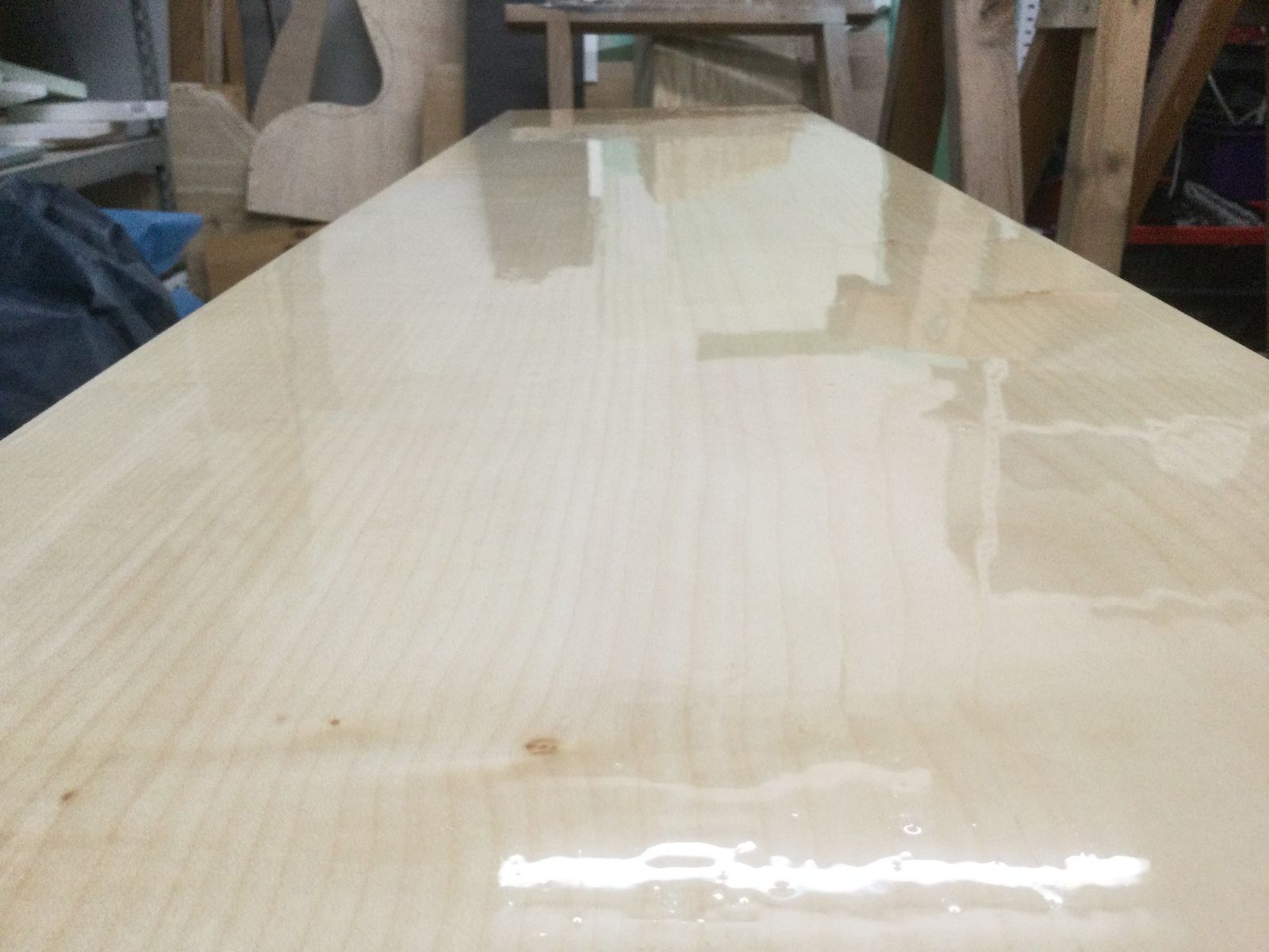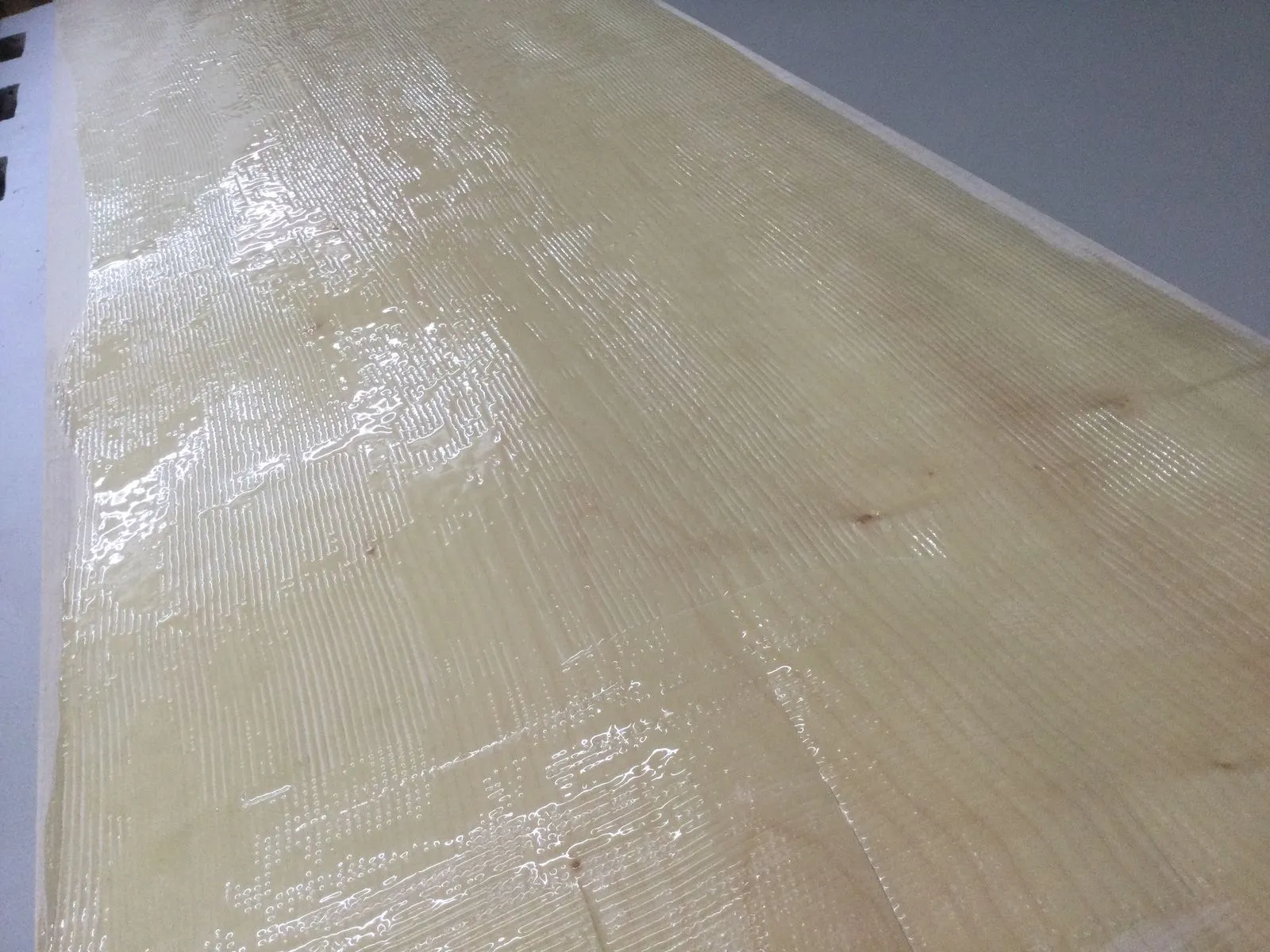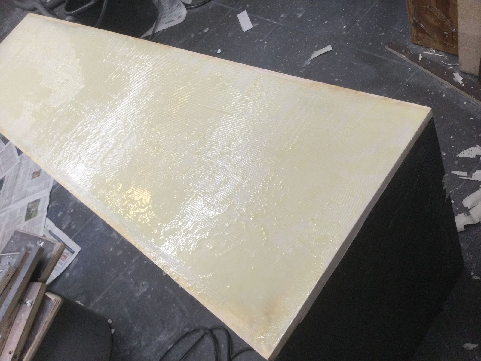 Dann habe ich mit meiner Frau dünne Vinyldielen ausgesucht. Demnächst also der Fussboden, wo der Verlauf der Fussbodenheizung noch nachgespachtelt werden muss. Darauf sollten die im Prinzip fertigen Sitzkisten. Leider ist das unbehandelte Furnier in den letzten fast vier Jahren ansatzweise vergammelt und je nach Feuchtigkeit gab es Delaminationen. Diese habe ich dann aufgeschnitten und beim spachteln gemerkt, dass die Fläche stark nach innen gewölbt ist. Jetzt ist die Kiste ungefähr 1 kg schwerer und hat eine neue, ebene Furnierschicht bekommen, die mit Pattex aufgeklebet wurde.