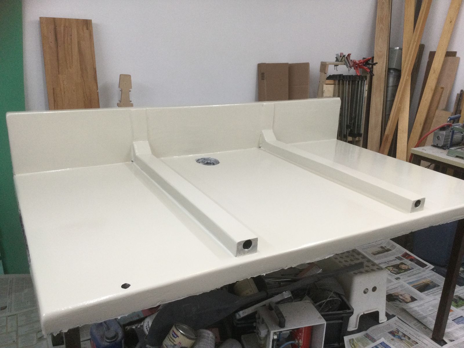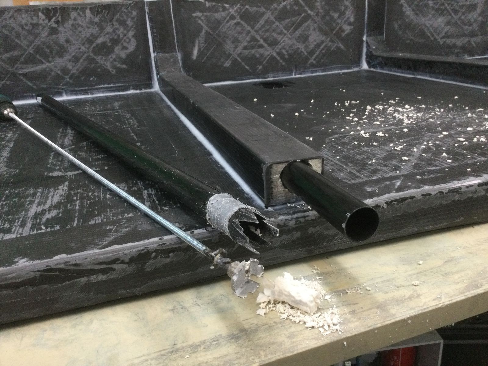 Die Terrasse wurde mit den L-Winkeln verstärkt, die auf der Rückseite Öffnungen für die Druckluftzylinder bekommen haben. Die Stützen der Terrasse sollen in den Trägern verschwinden. Sie sind damit gut zugänglich und bei hochgeklappter Terrasse durch den Spoiler gegen Herausfallen gesichert. Ich habe ein Kohlefaserrrohr als Bohrkrone präpariert und kam bis zu einem Harzpropfen gut durch. Dann musste ein Fräser, angeschweisst an eine Gewindestange weiterhelfen.