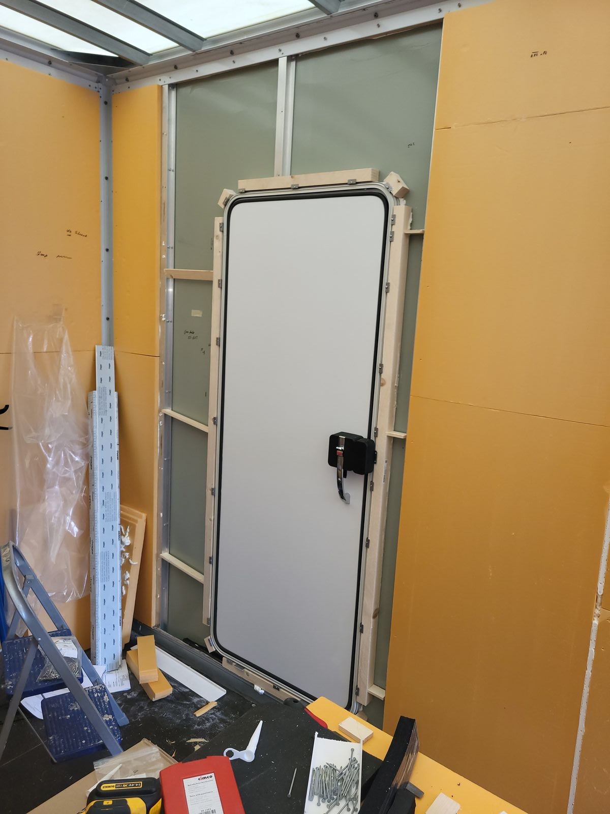 Mal schauen, ob das schon reicht, oder ob die Wand von innen noch eine "Behandlung" braucht. Ich nehme an, dass spätestens, wenn neben der Tür die Garderobe montiert wird, die gewünschte Steifigkeit erreicht ist.