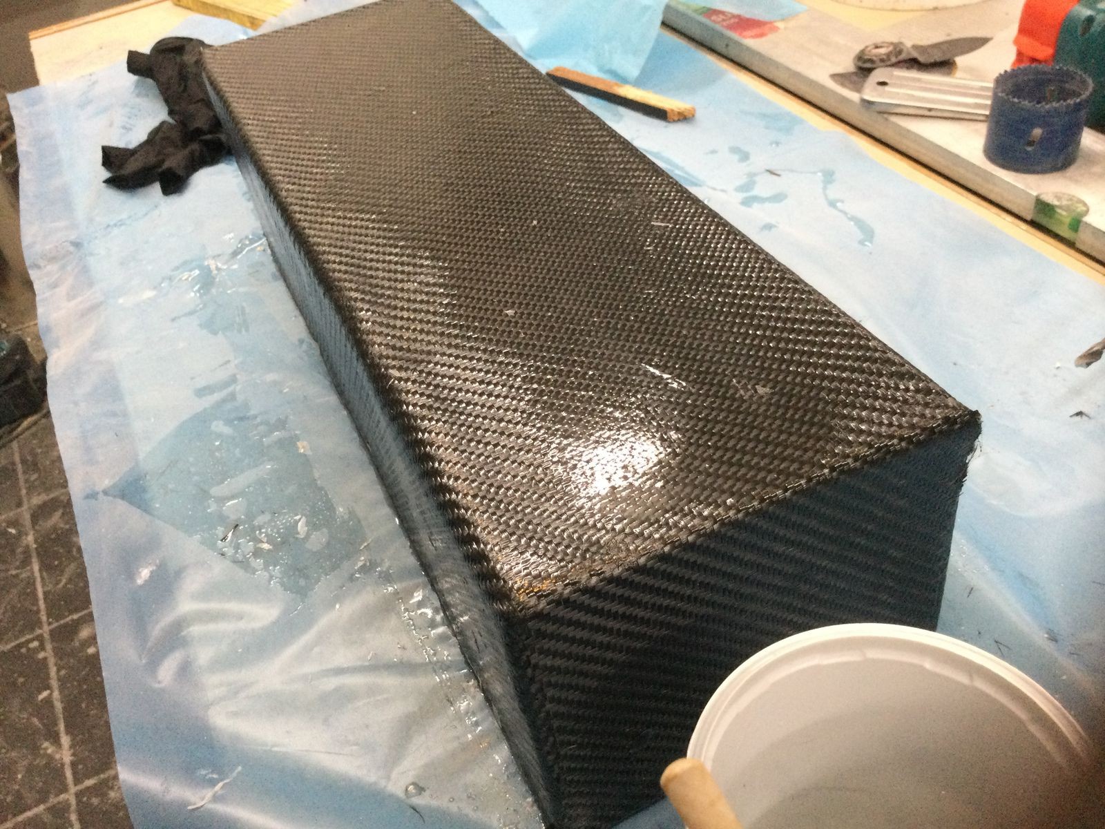 Dann mit schiebefestem Gewebe bespannt, dass man durch bügeln fixieren kann. Ausser das das Zeug teurer ist macht das richtig Spass. Zuerst die Oberseite fixiert, an den Seiten eingeschnitten, an den Seiten festgebügelt und die letzten 5 cm 180° um die Kante herum. Kein Zerfransen der Ränder, kein widerspenstiges Zurückspringen an den Ecken, einfach mit Harz eingekleistert.