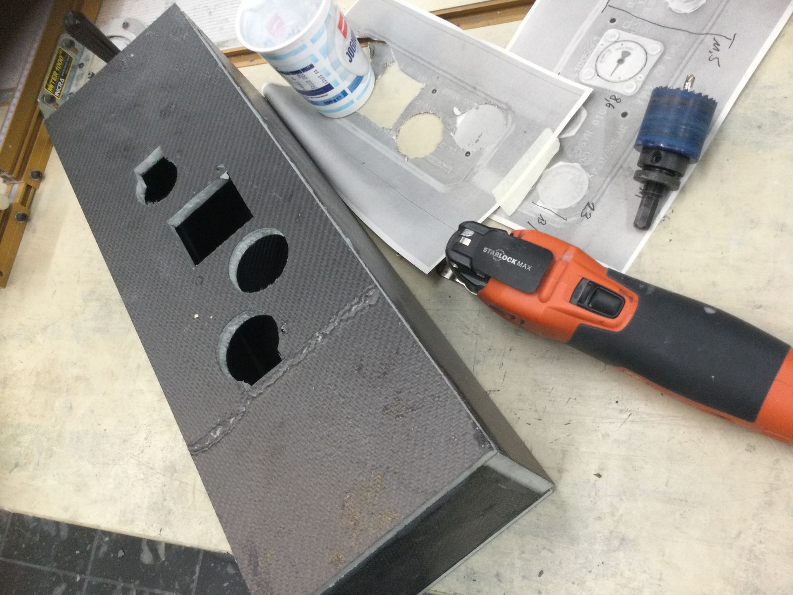 Also Reststücke von Sandwichplatten 5 und 10 mm zu einer Kiste zusammengeklebt und Löcher hineingefräst.