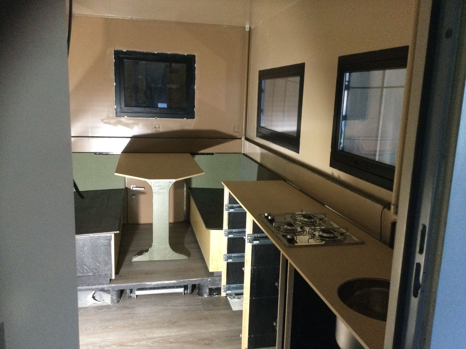 Aber als er die herunterhängenden Kabel, die fehlenden Schubladen, das unlackierte Klo gesehen hat, fand er im Gegensatz zu der Aussage im Frühjahr, dass es wohl doch mehr nach LKW mit Ladebordwand als nach Wohnmobil aussieht.