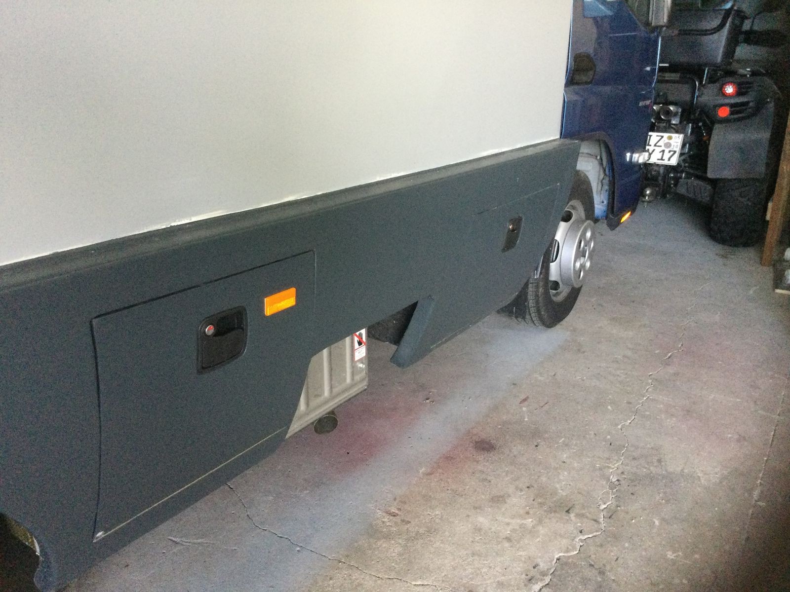 Da der Fuso vorne bereits Seitenreflektoren hat und zwischen den Reflektoren maximal 3 m Abstand sein darf, gab es noch einen dazwischen, ohne die Fahrzeugbreite zu verändern. Wenn ich den ersten abgefahren habe, werden die in dem Aufbau bündig versenkt.