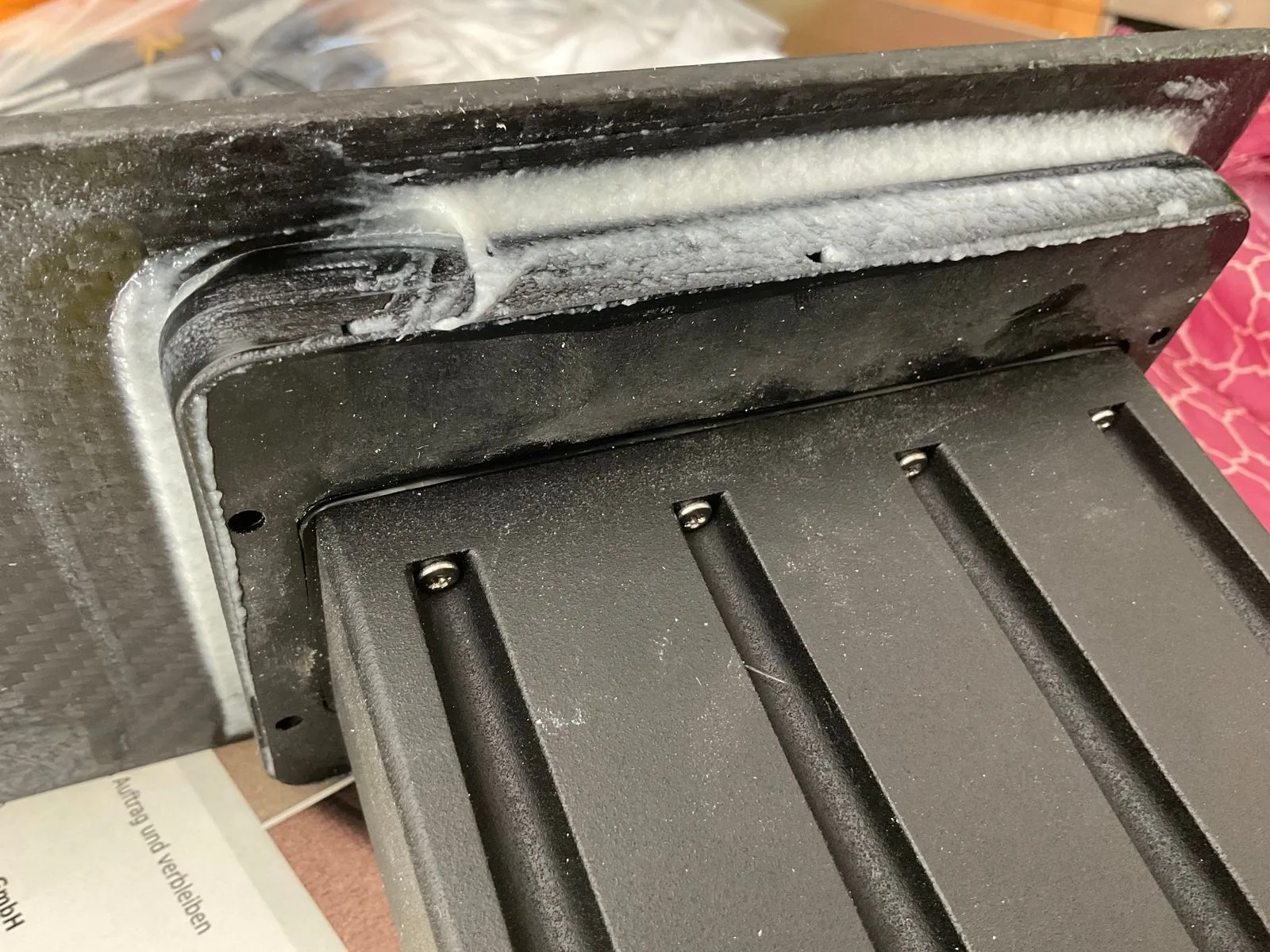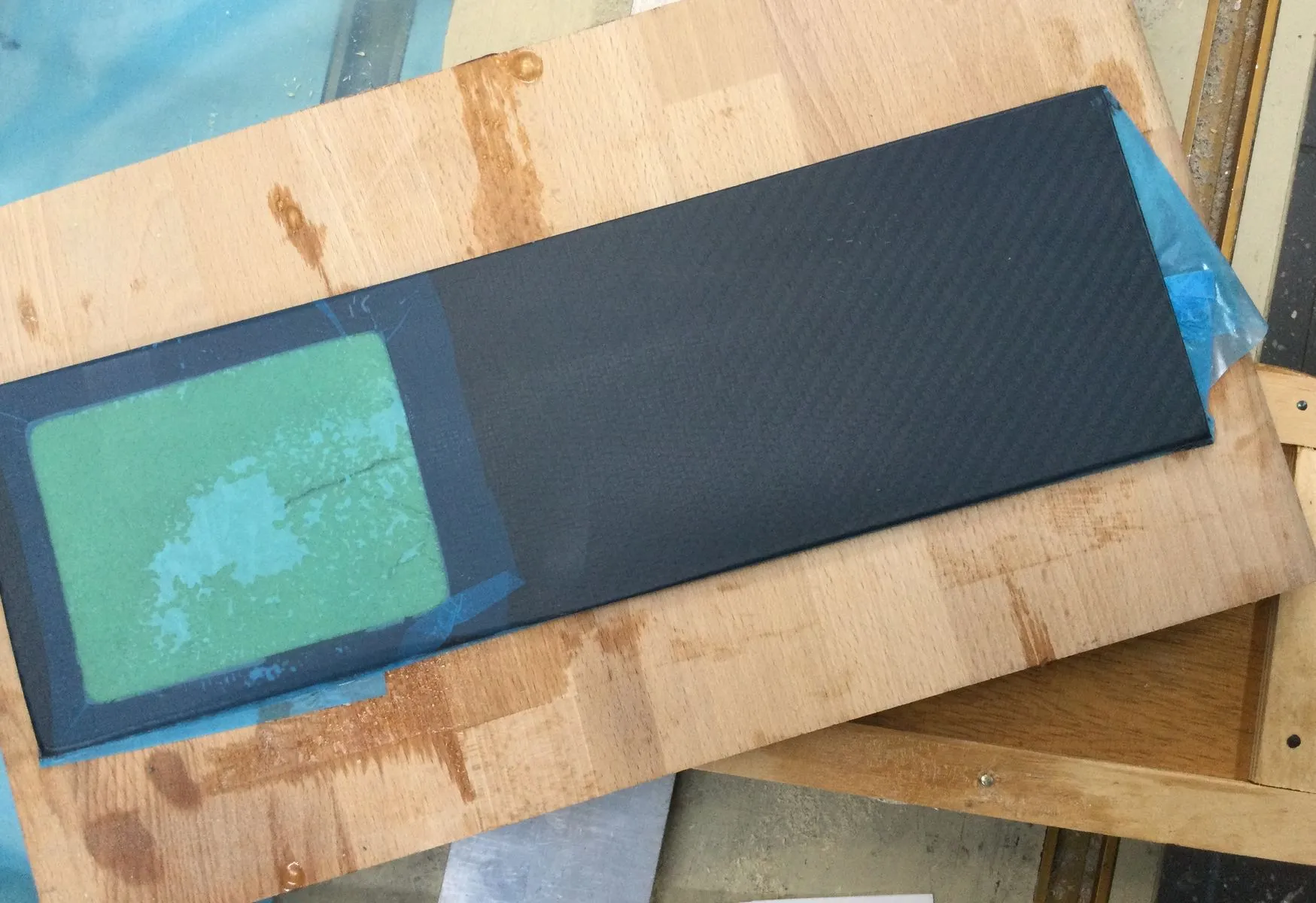 Damit ich wieder in Schwung komme, habe ich ein vermeintlich einfaches Projekt ausgesucht. Mit einer Hartschaumplatte bin ich viermal zwischen Keller und Halle hin- und hergelaufen, bis sie passend zugeschnitten war. Dann eine leicht grössere Form gebaut, die Öffnung für das Radio geschnitten und die Platte mit 2 Lagen Kohlefaser umwickelt. Die Kohlefaser im Ausschnitt wurde eingeschnitten und das in Trennfolie eingewickelte Reststück reingehämmert.