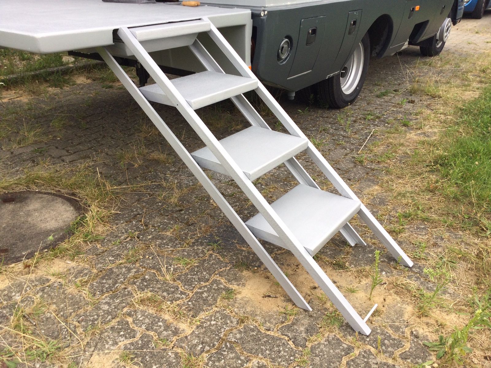 Die Treppe steht jetzt weniger weit aus der Terrasse heraus, weil fast die komplette obere Stufe in dem Treppenkasten steckt. Durch die Verstärkung lässt sich die Treppe jetzt ohne Schreckmoment betreten. Ein schwerer Aluminiumgriff hilft beim herausziehen, wenn die Treppe komplett im Kasten verschwunden ist.