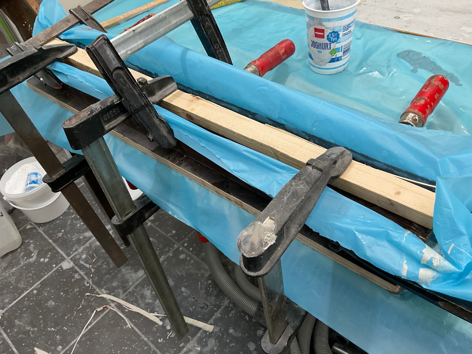 Die Treppe war doch überraschend kippelig, weil sie nur 15 cm in dem Schacht steckte und die Stufen beim drauftreten wegkippten. Nicht gefährlich aber auch nicht schön. Also habe ich die dünne Rückseite der Terrasse eingesägt und eine Verstärkungsplatte als Handlaminat aufgeklebt. Natürlich bedeutet das Weglassen von Vakuum, dass die Fasern nicht sauber um die Ecken kommen. Dazu waren die beiden zusammengestückelten Dämmstoffplatten nicht gleich dick. Also meine Lieblingsbeschäftigung: Spachteln, Sch...