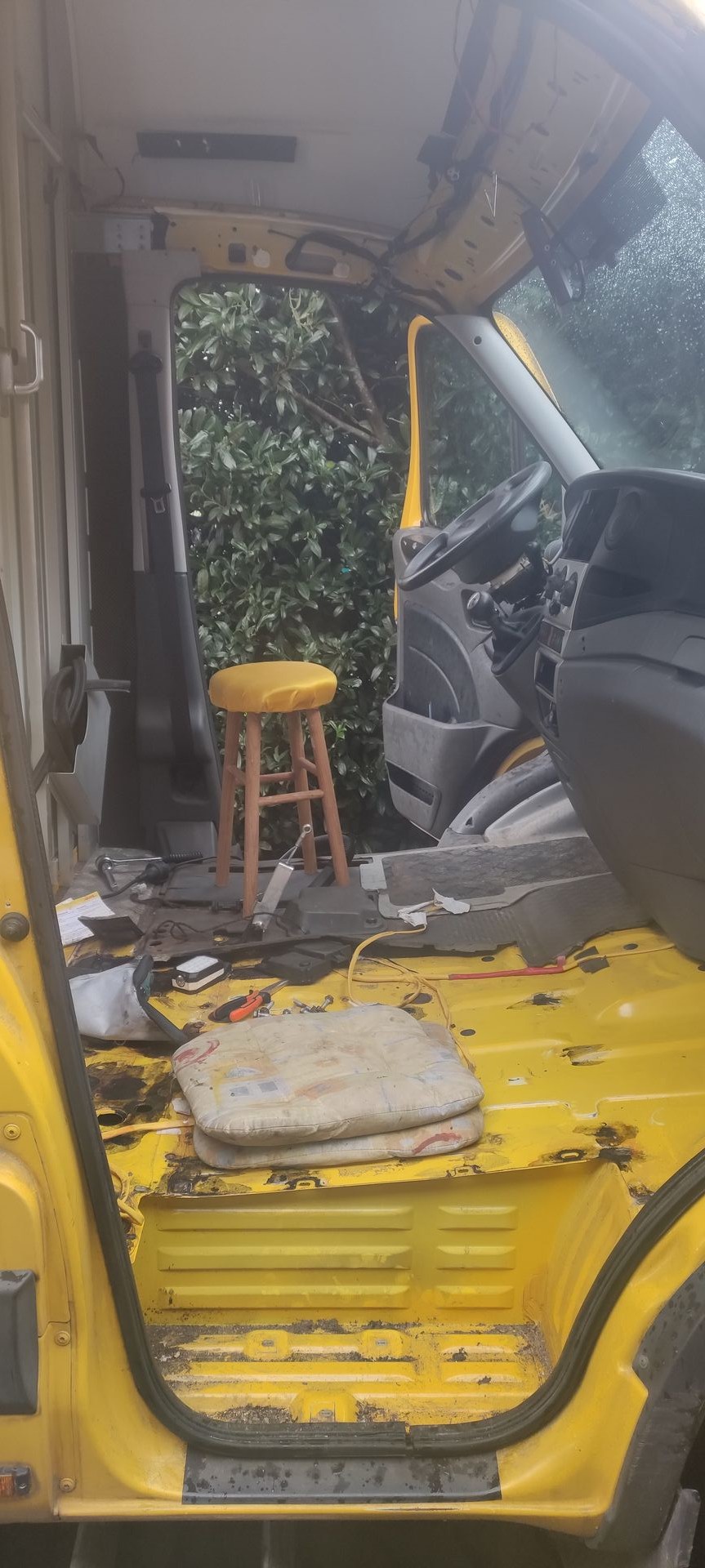 Nach etwa einer Woche fahren mit dem Postkoffer drang im Fahrerhaus Wasser ein. Also erstmal alles zerlegt, im selben Verlauf auch gleich die Sitze raus und den Boden entrostet und neu gestrichen....