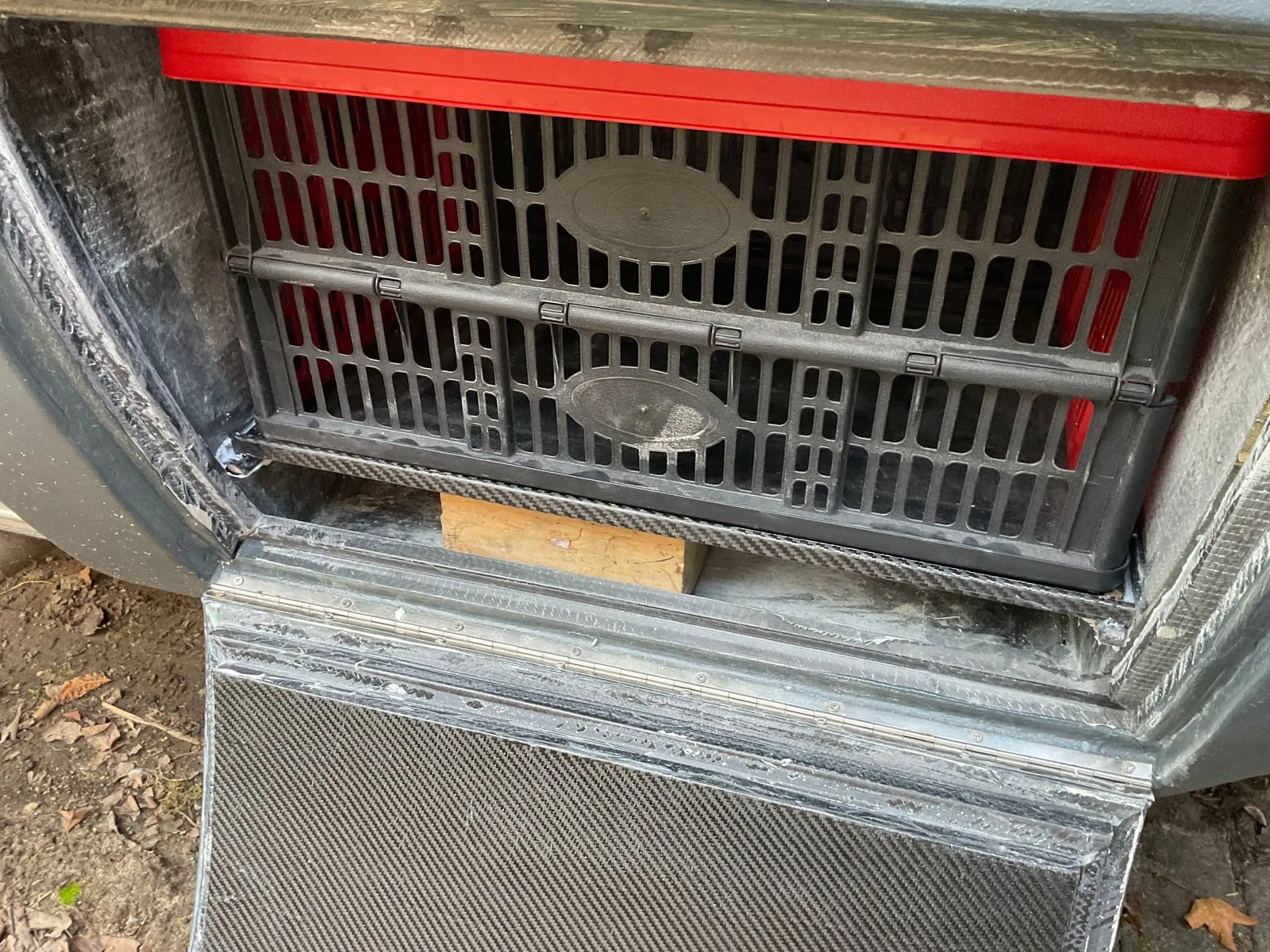 Etwas unkonzentriert habe ich die Platte für die Einkaufskiste eingeklebt. Sie musste etwas höher, damit sich die runde Klappe schliessen lässt. Leider habe ich das Stützholz unten vergessen ![]()