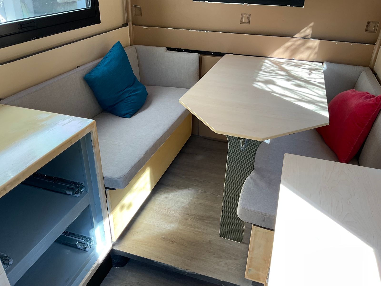 Die Stolperkanten des Tischfusses wurden abgesägt und oben zur Verstärkung in alle Richtungen unter der Tischplatte wieder angeklebt. Das Hübschen steht wie an fast allen Stellen noch aus. Mit Kühlschrank, Sitzkissen und provisorischen Sofakissen sieht es jetzt so aus: