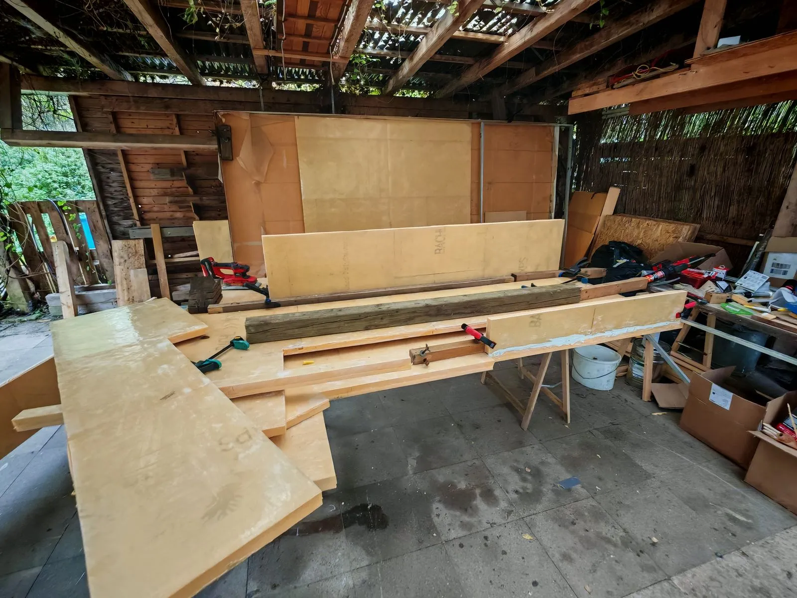 Dach fertig vorbereitet heißt Epoxid Glasfaser beidseitig. Habe übrigens wie schonmal besprochen das Dach 1cm gewölbt. Hilft hoffentlich gegen durchhängendes Dach.