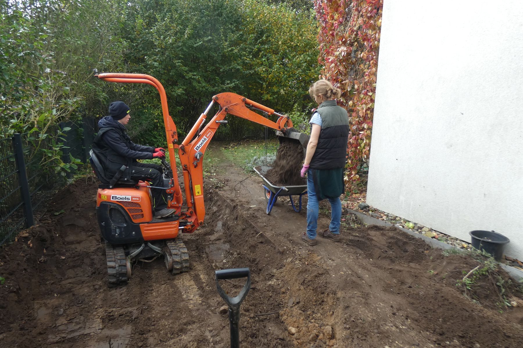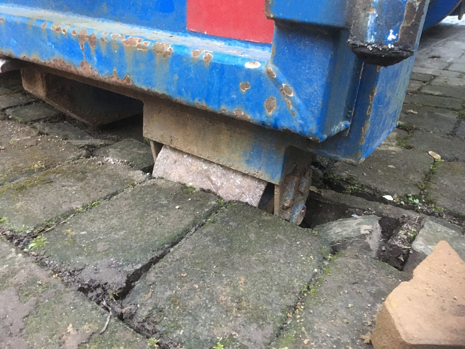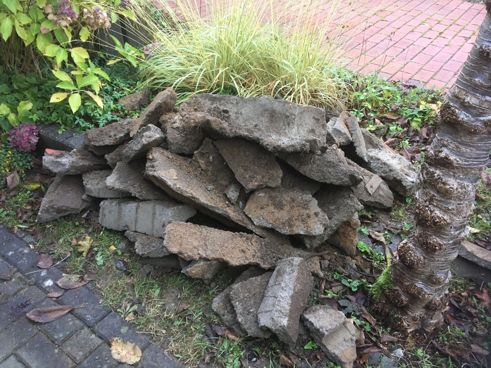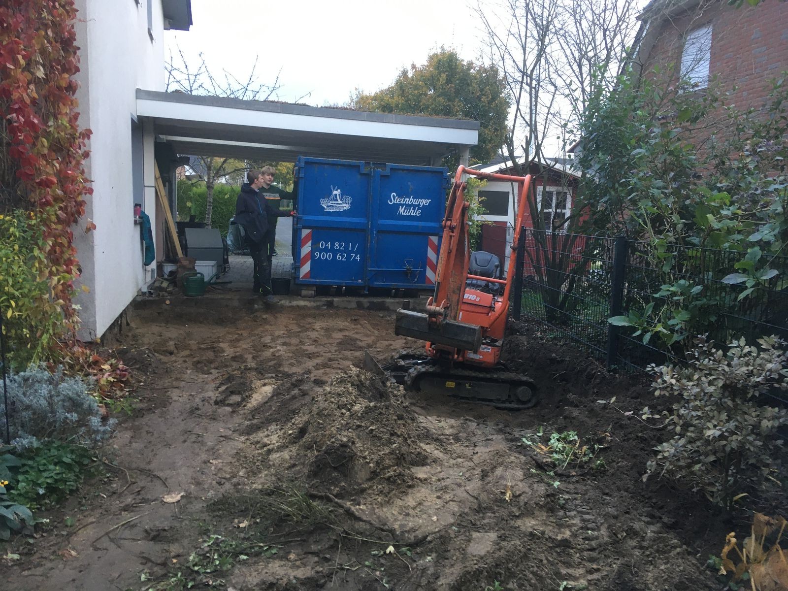 Dann schien es mir eine gute Idee, den Container mit dem Mineralgemisch dicht an die Baustelle heranzuschieben zu lassen, leider mit Kollateralschäden auf der vorhandenen Auffahrt.