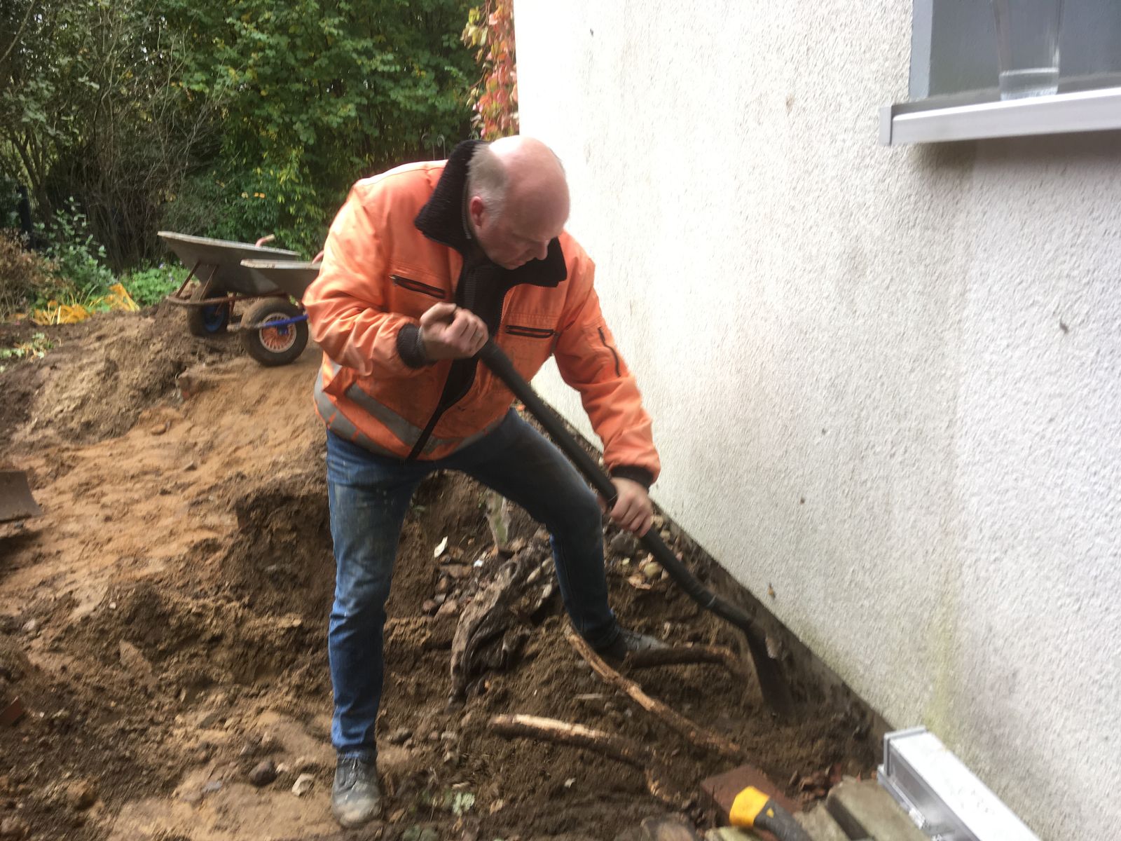 Die Wurzeln von einem Busch sind dicht am Haus in die Tiefe abgetaucht, zum Glück nicht durch die Wand in den Keller.