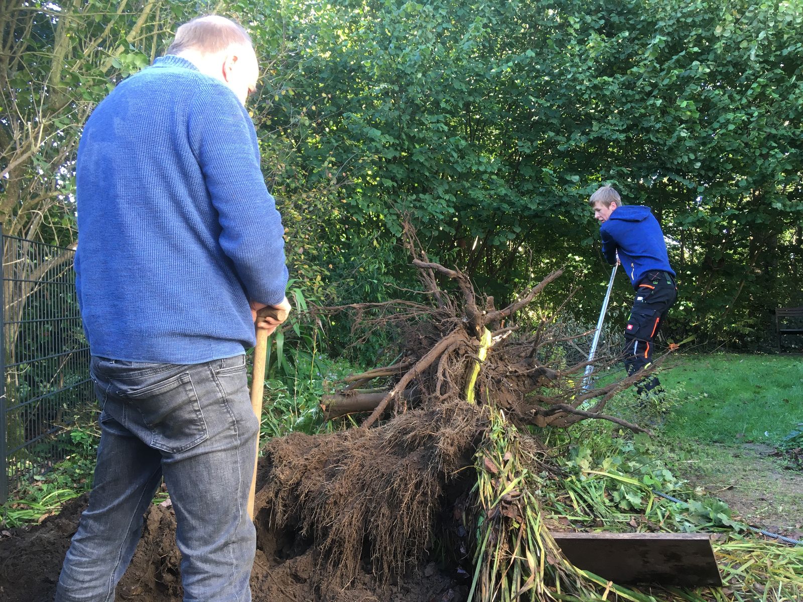 Jetzt in den späten Herbstferien geht es endlich mit dem Stellplatz los. Zunächst wurden Büsche gefällt und die Wurzeln mit einem 3to Greifzug herausgezogen.