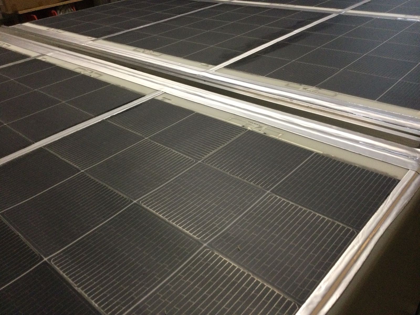 Heute nochmal in der Halle die Heizung angemacht und die Ränder der Solarzellen mit Alubutylklebeband überdeckt. Bitte nicht über die Solarzellen schimpfen. Ich habe gedacht, dass die geringe thermische Dehnung von Kohlefaser und Solarzellen gut zusammenpassen. Leider habe ich damit eine Pumpe gebaut, die mir Regenwasser in die Kabelkanäle geschaufelt hat, weil die Kunststofffolie unter den Solarzellen doch die Ausdehnung dominiert. An den Verteilerdosen innen am Dach ist es dann herausgetropft und genau senkrecht darunter war die Motorsteuerung vom Hubdach
