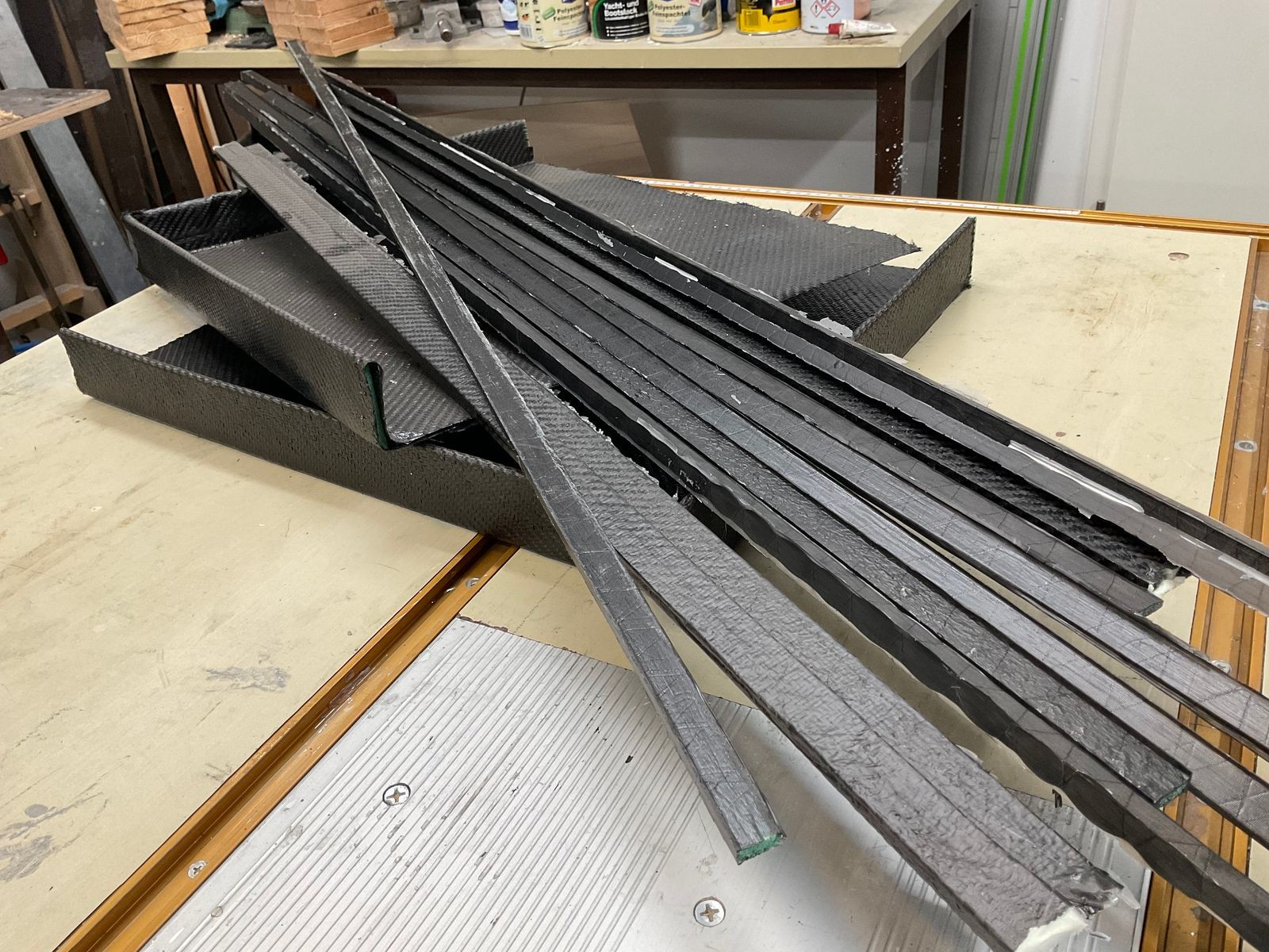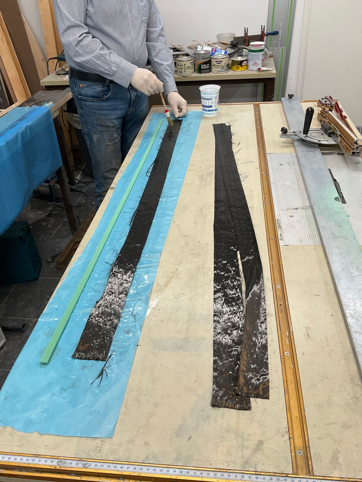 Für die unteren Kanten der Rollostoffe habe ich kleine Stäbe hergestellt. Weil sich Gewebe nicht gut um so kleine Kerne wickeln lässt, habe ich unidirektionale Fasern verwendet und als 8er-Pack laminiert.