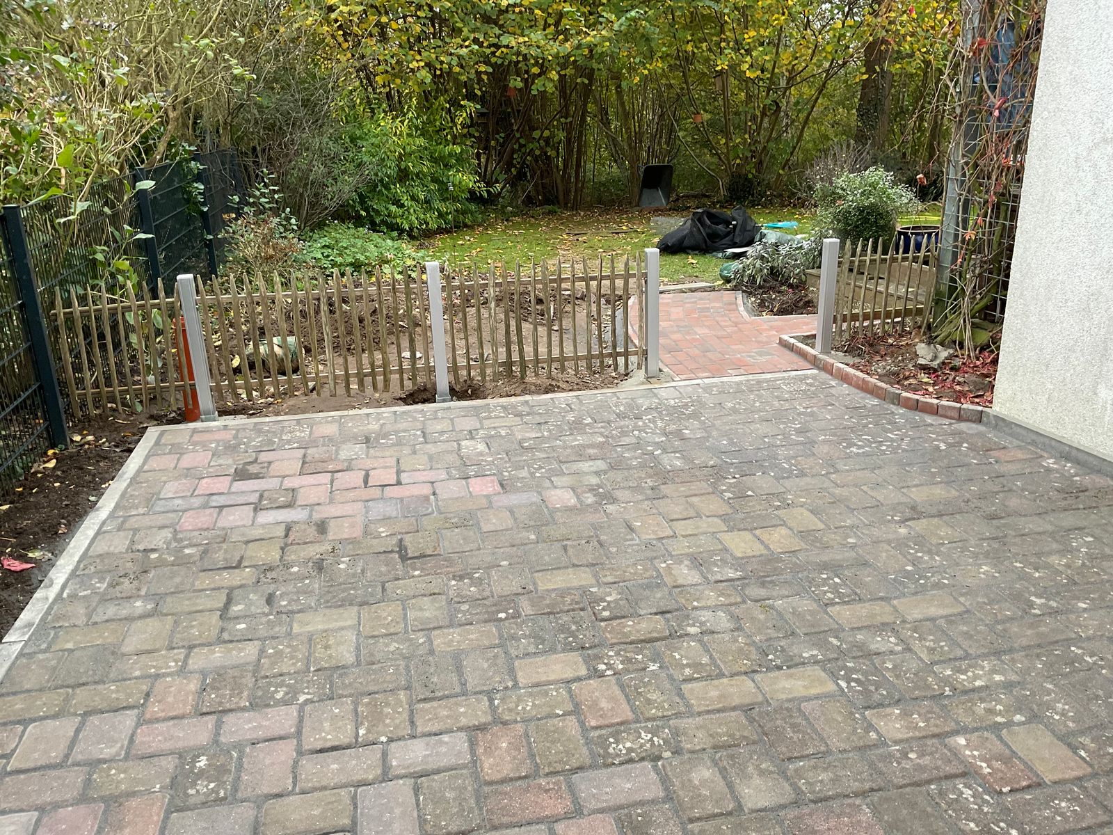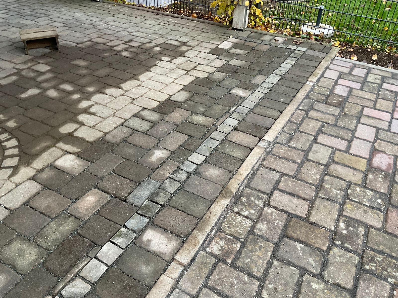 Die Randsteine des alten Weges haben genau gereicht für einen neuen Klinkerweg. Dann noch 5m2 von der alten Auffahrt wegen der Kollateralschäden vom Container aufgenommen und in ein neues Splittbett gelegt. Alles in zwei Wochen geschafft. Das Einebnen und die Neuanlage des Beets und das Aufräumen kamen dann später.