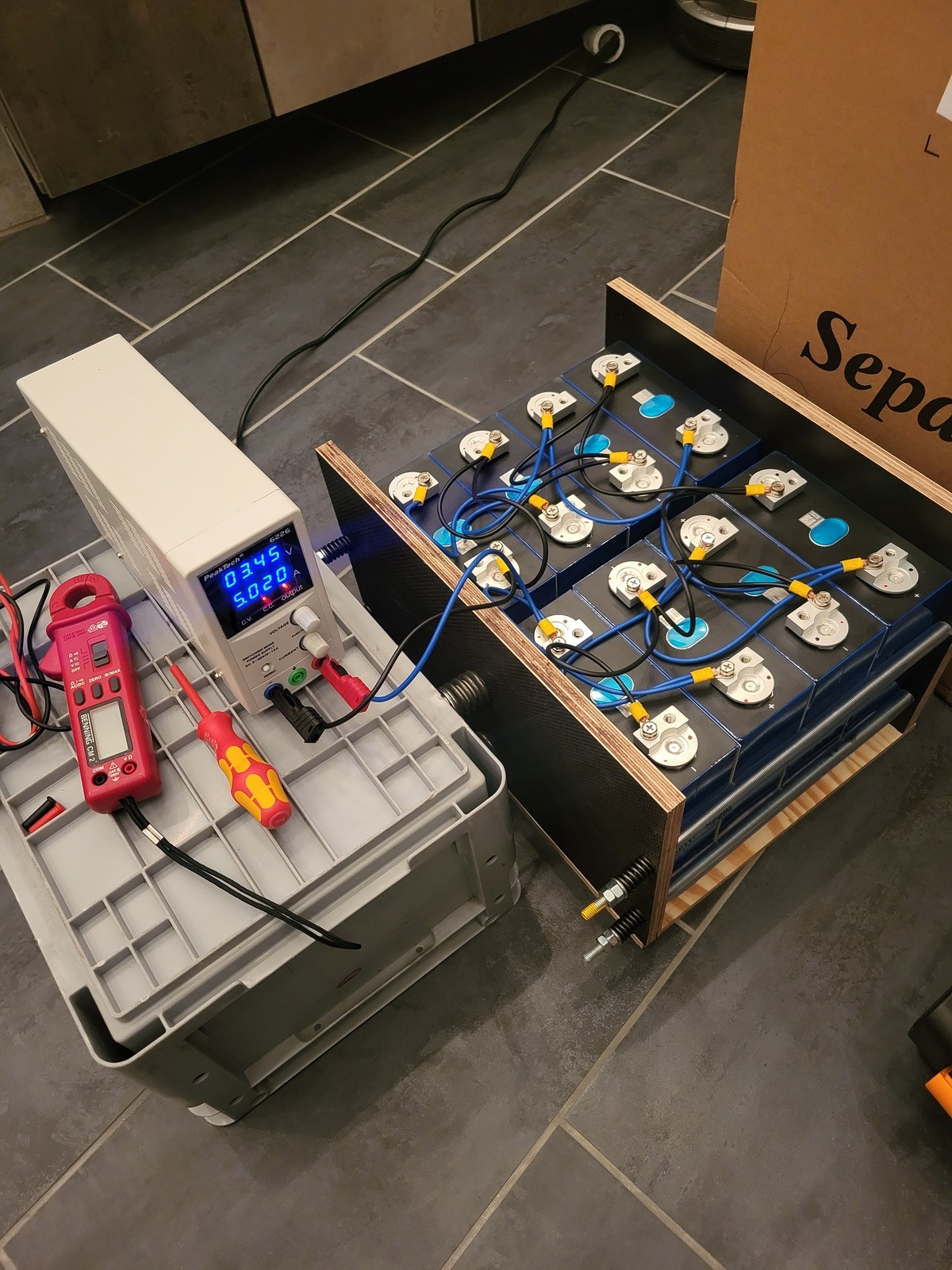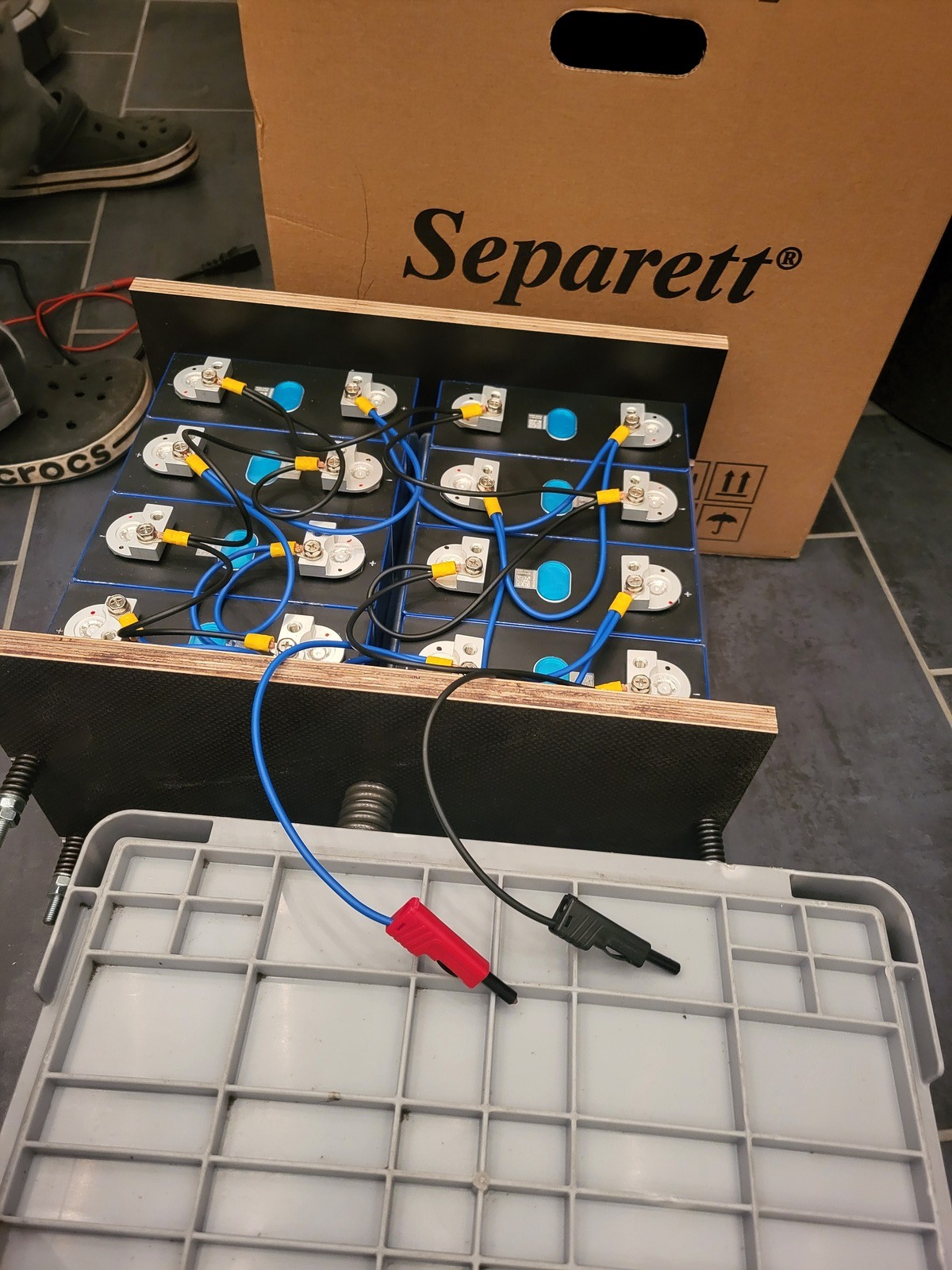 8 EVE LF280K LiFepo-Zellen haben ihr neues Zuhause zwischen zwei 15mm Siebdruckplatten gefunden.