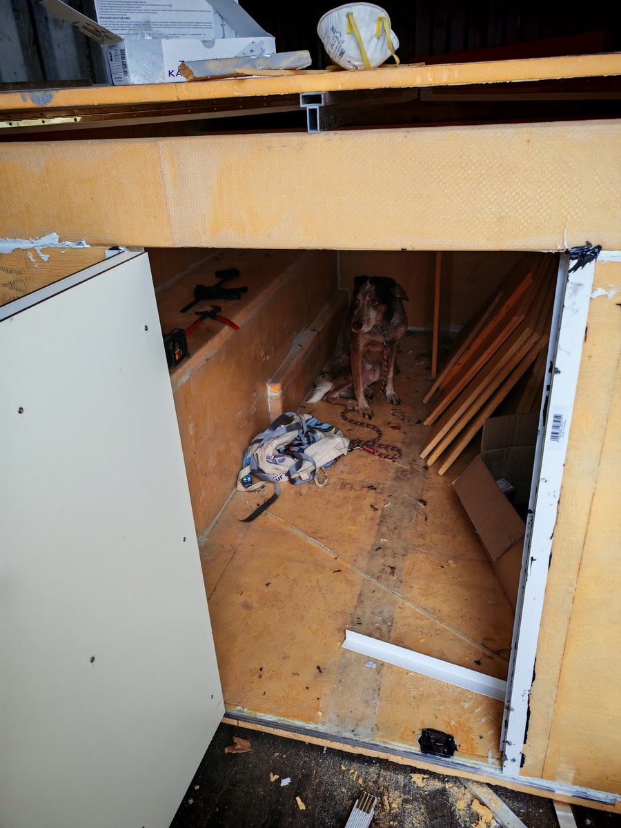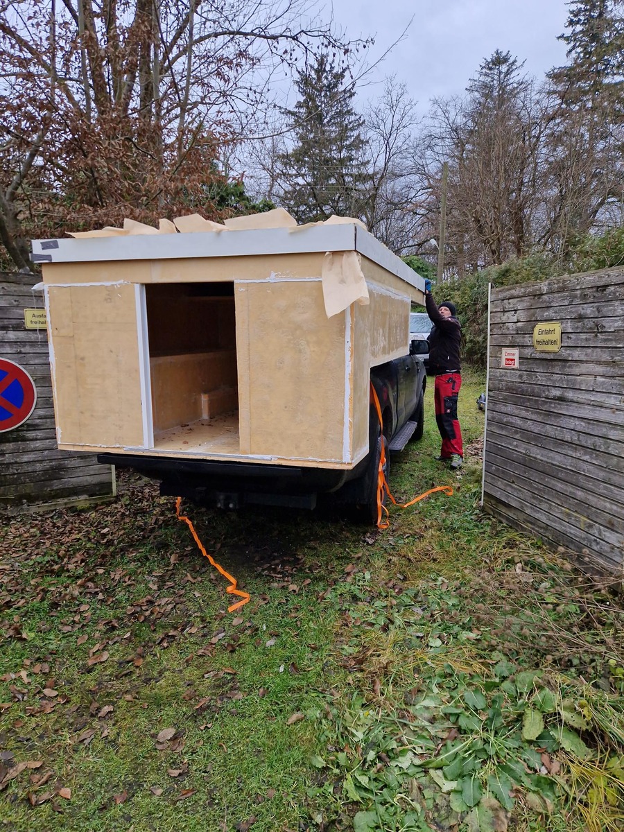 Wie man im Titelbild mit geübten Augen sieht, bin ich doch noch in einen Container über der Winter eingezogen. Kabine mit Dach ist für vier kräftige Personen langsam an der Grenze, was geht. Vorallem, da noch keine Stützen angebracht sind und deswegen die Kabine von der Pritsche auf Bodenhöhe von Hand erfolgte.