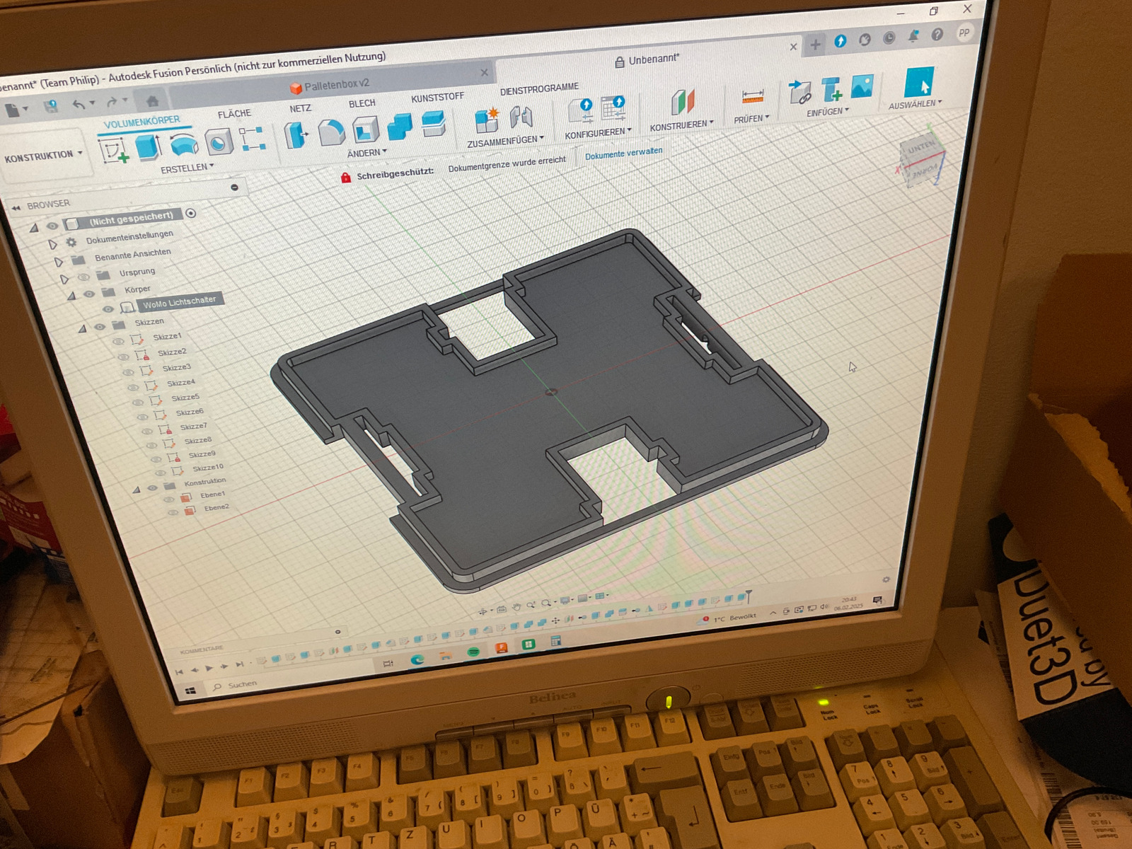 Für die Taster habe ich bei der Produktion der Wände bereits die Rahmen und Leerrohre integriert. Meinem Sohn habe ich davon beim Abendessen erzählt, 15 Minuten später war die Zeichnung fertig und der Drucker hat seine Arbeit begonnen. Die Schaltwippen mussten etwas ausgehöhlt werden, damit die Taster fast flächenbündig in der Wand sitzen. Die Taster habe ich mit Harz eingeklebt.