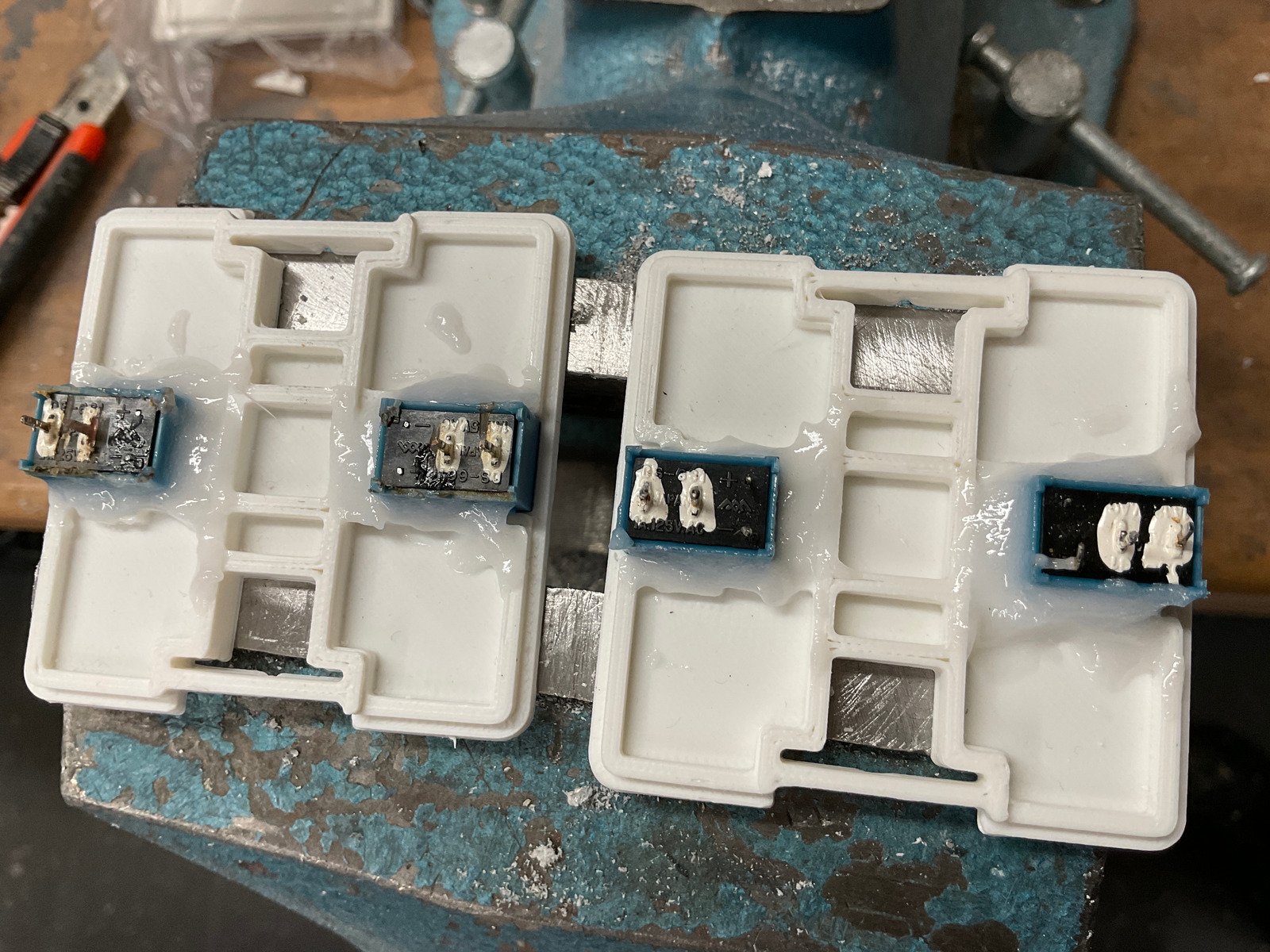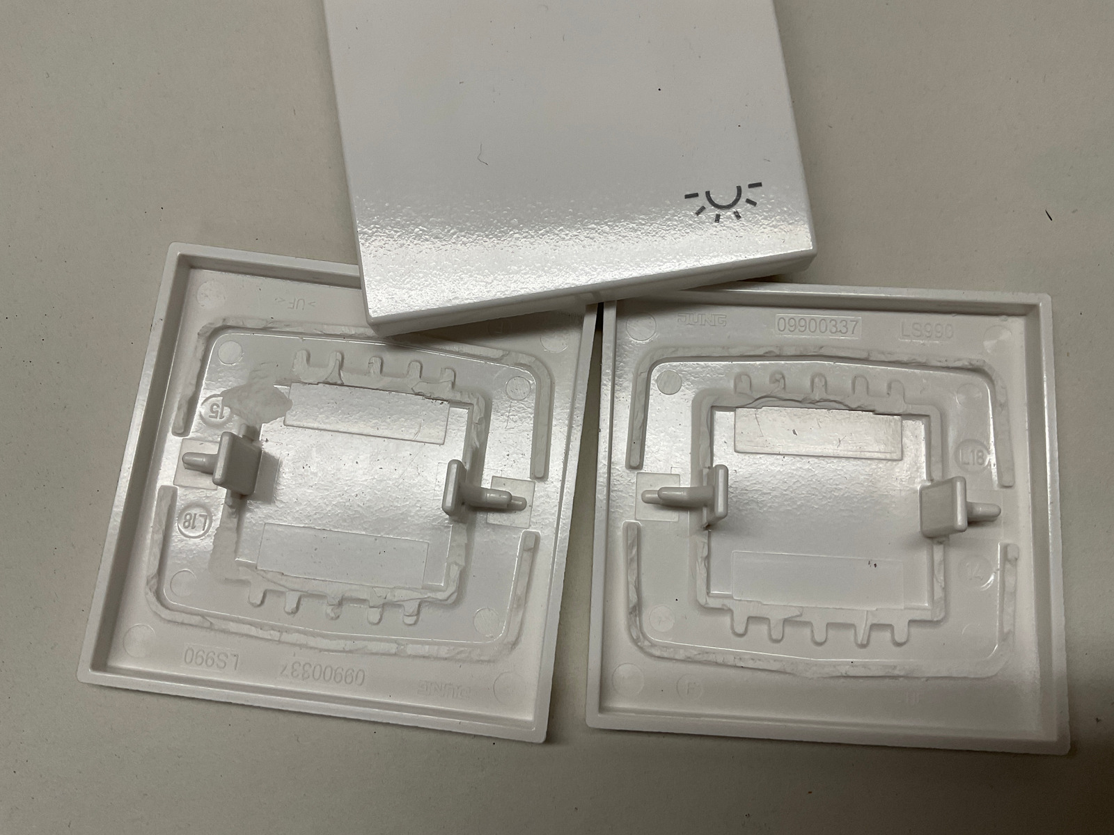 Für die Taster habe ich bei der Produktion der Wände bereits die Rahmen und Leerrohre integriert. Meinem Sohn habe ich davon beim Abendessen erzählt, 15 Minuten später war die Zeichnung fertig und der Drucker hat seine Arbeit begonnen. Die Schaltwippen mussten etwas ausgehöhlt werden, damit die Taster fast flächenbündig in der Wand sitzen. Die Taster habe ich mit Harz eingeklebt.
