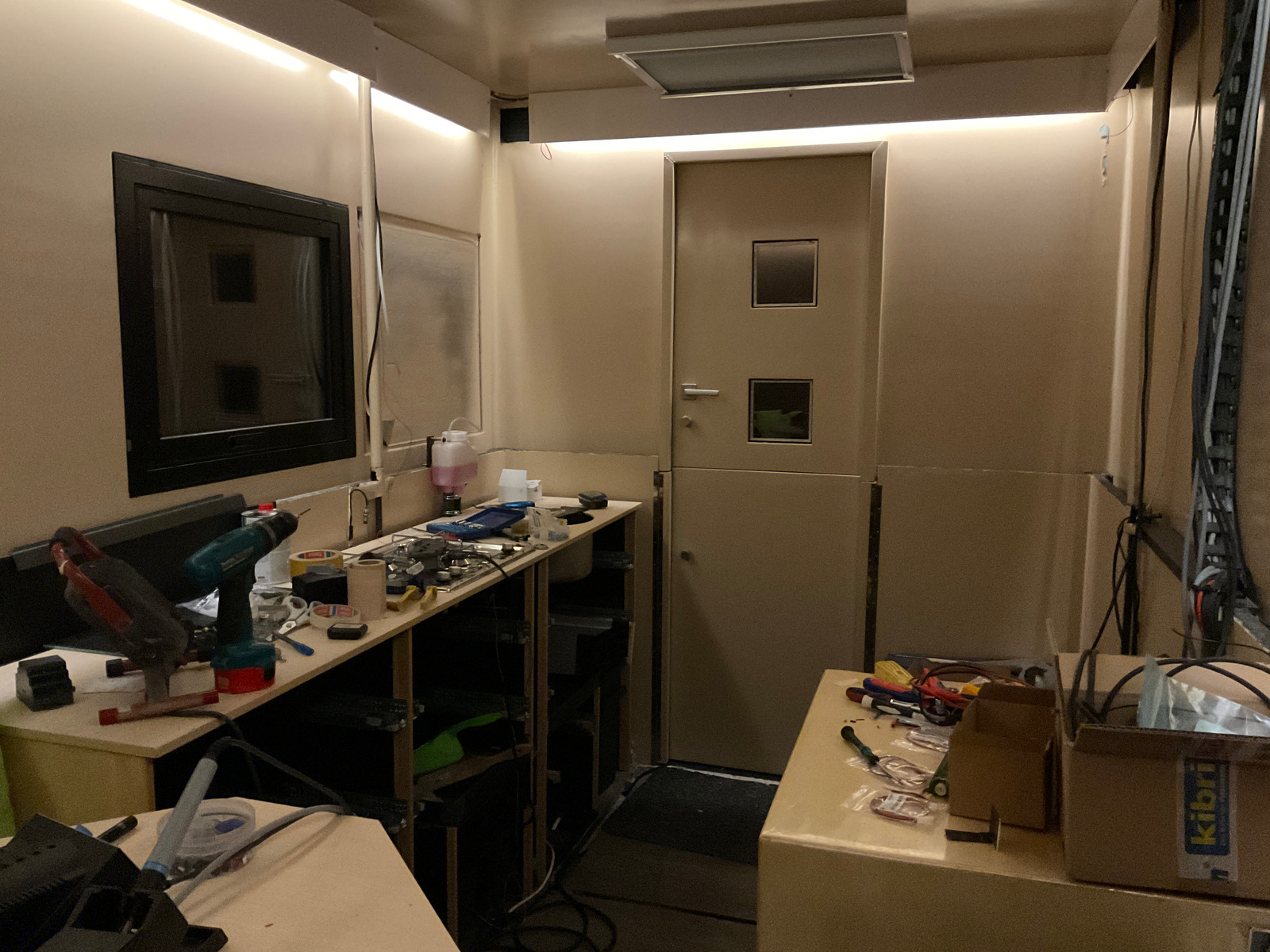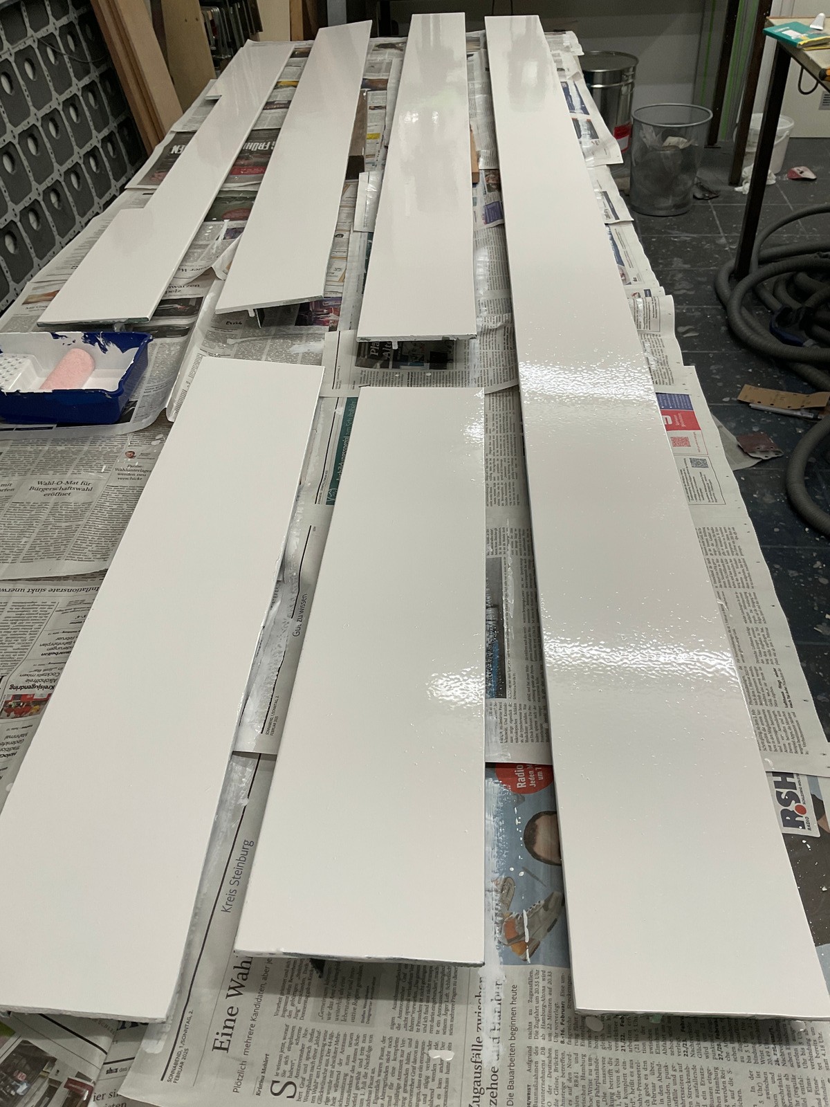 Die Blenden wurden grundiert, weiss lackiert und mit warmweissen COB-LED Streifen beklebt. Vor der Montage der Blenden wurde der umlaufende Kabelbaum verlegt. Die LEDs haben Steckverbinder, so dass man die Blenden jederzeit abnehmen kann.