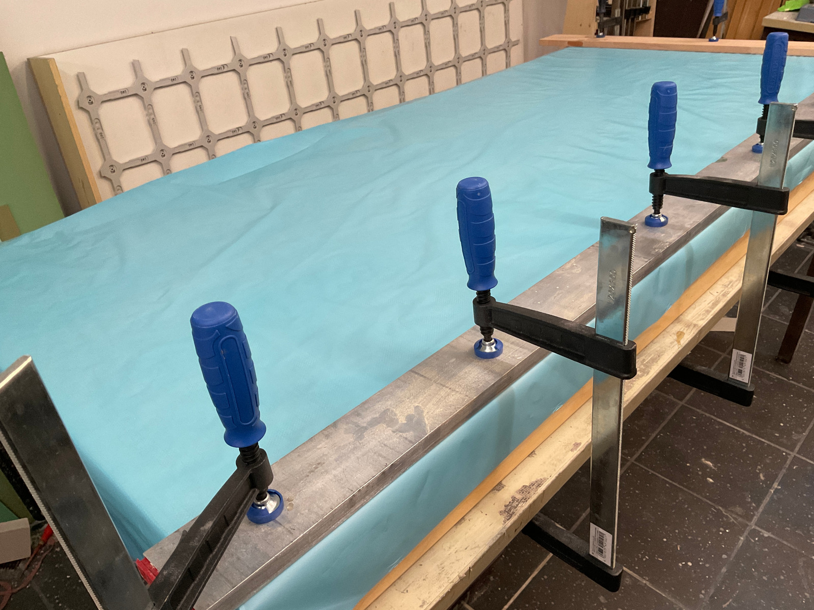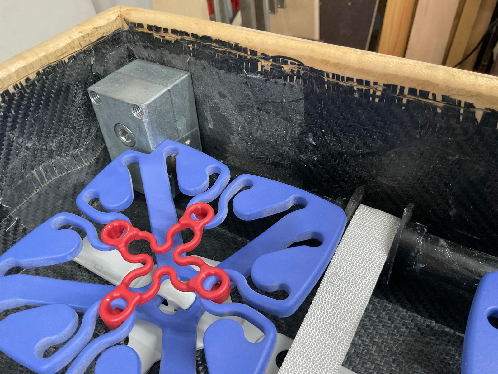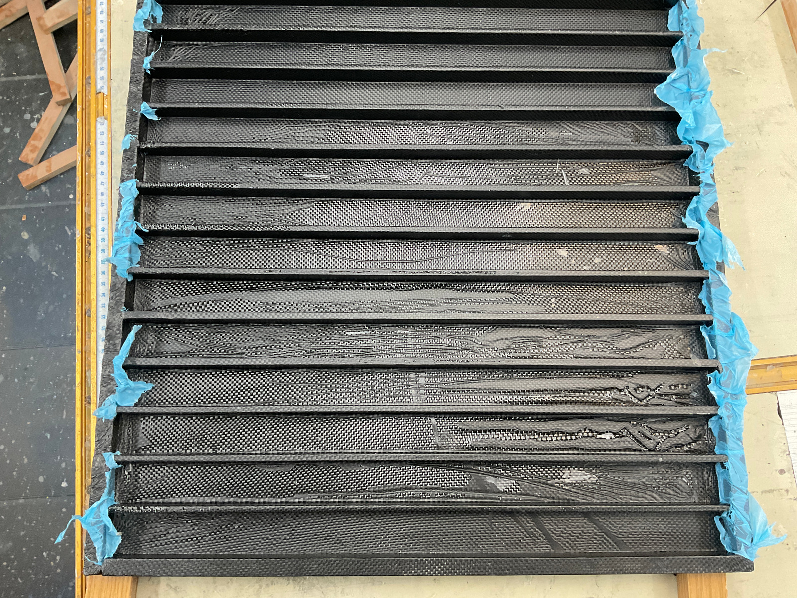 Was gibts noch: ich habe eine Abdeckung für die Elektrotechnik gebaut. Mal schnell gezeichnet, Holz gesägt und laminiert. Die Platzhalter liessen sich nur mit Gewalt entfernen. Die gerippte Struktur von 450 gr ist natürlich begehbar und soll zum Abstellen schmutziger und nasser Schuhe dienen. Durch das mehrdimensionale Pressen ist Trennfolie zwischen Kohlefaserfalten geraten und wird noch rausgepult.