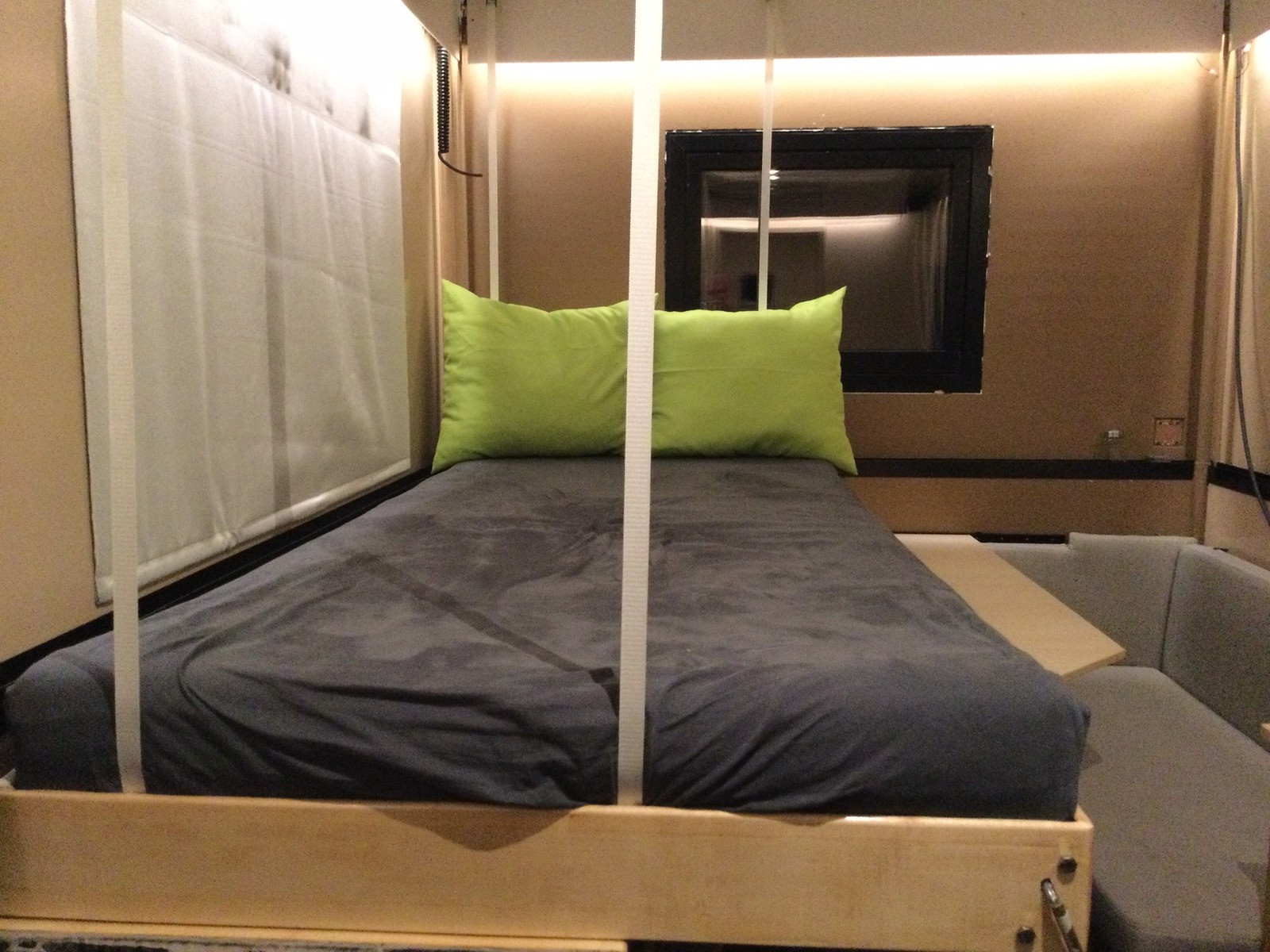 die Gurte werden in verstellbaren Schnallen befestigt, die an die Decke geschraubt sind, genauer gesagt, durch die Decke durch in die Aluminium-Dachträgerschienen, die zufällig an der richtigen Stelle sind. Die Gurte sind asymmetrisch, damit man vom Fussende über einen Tritt im Gang reinklettern kann, genau auf der Ecke, die komplett frei hängt. Viel schwerer darf ich nicht werden, sonst wird das Kopfende über die Tischkante hochgehebelt.