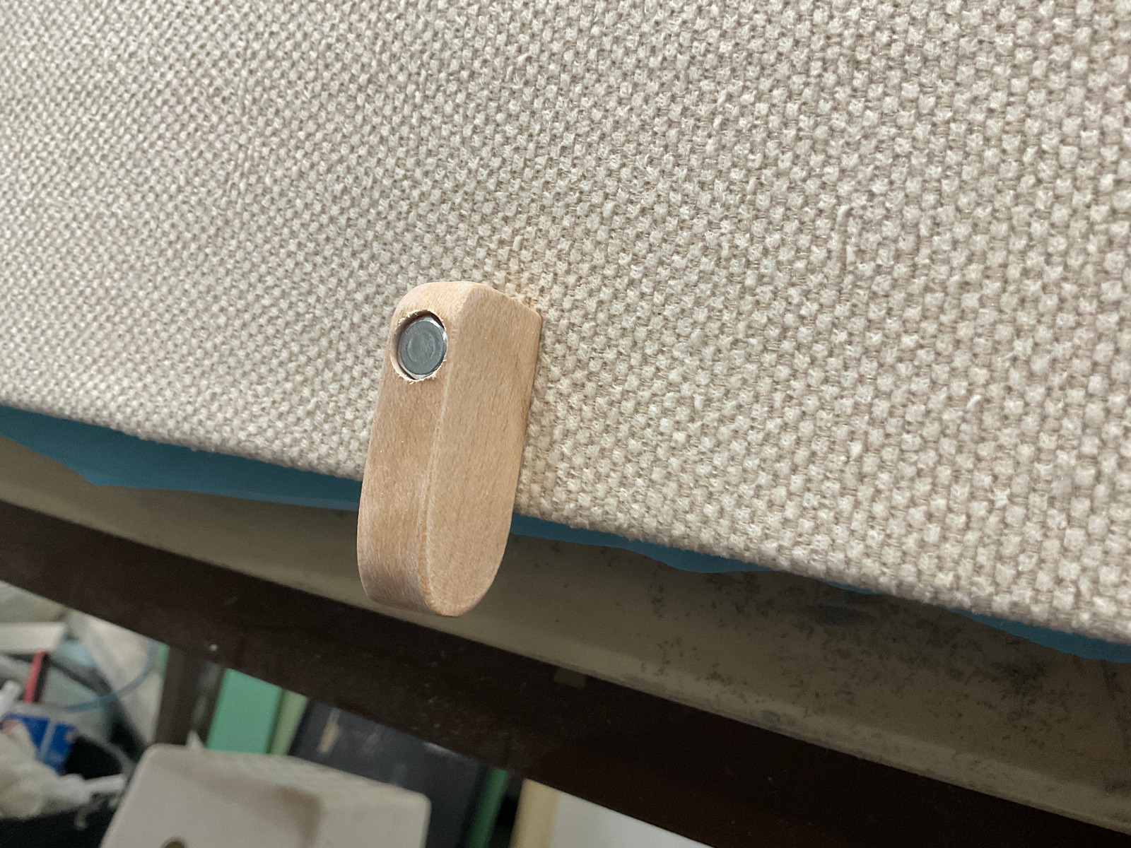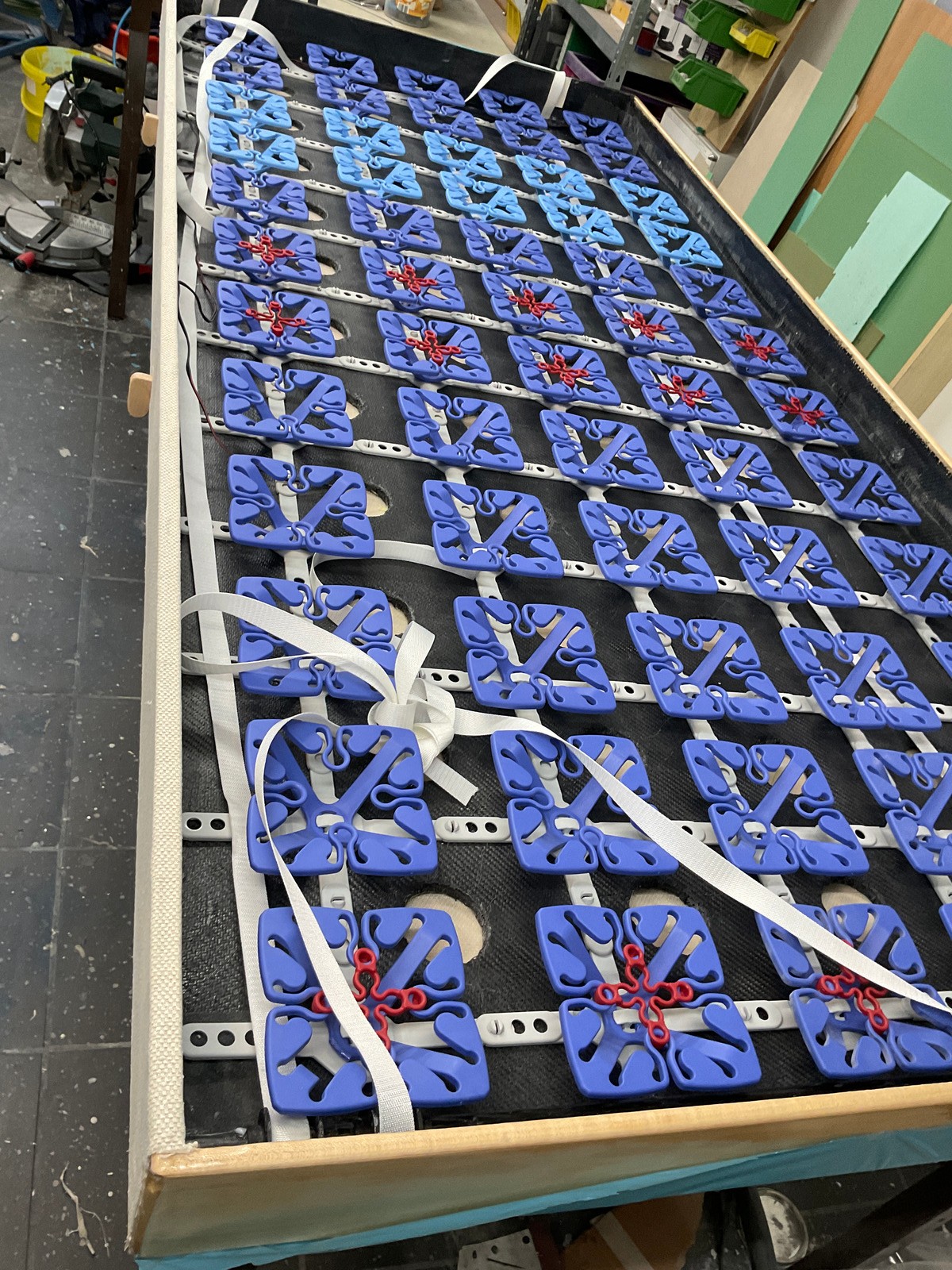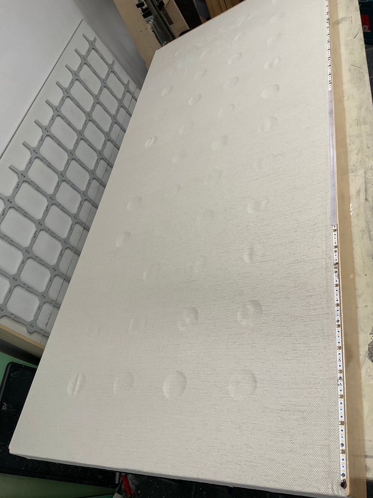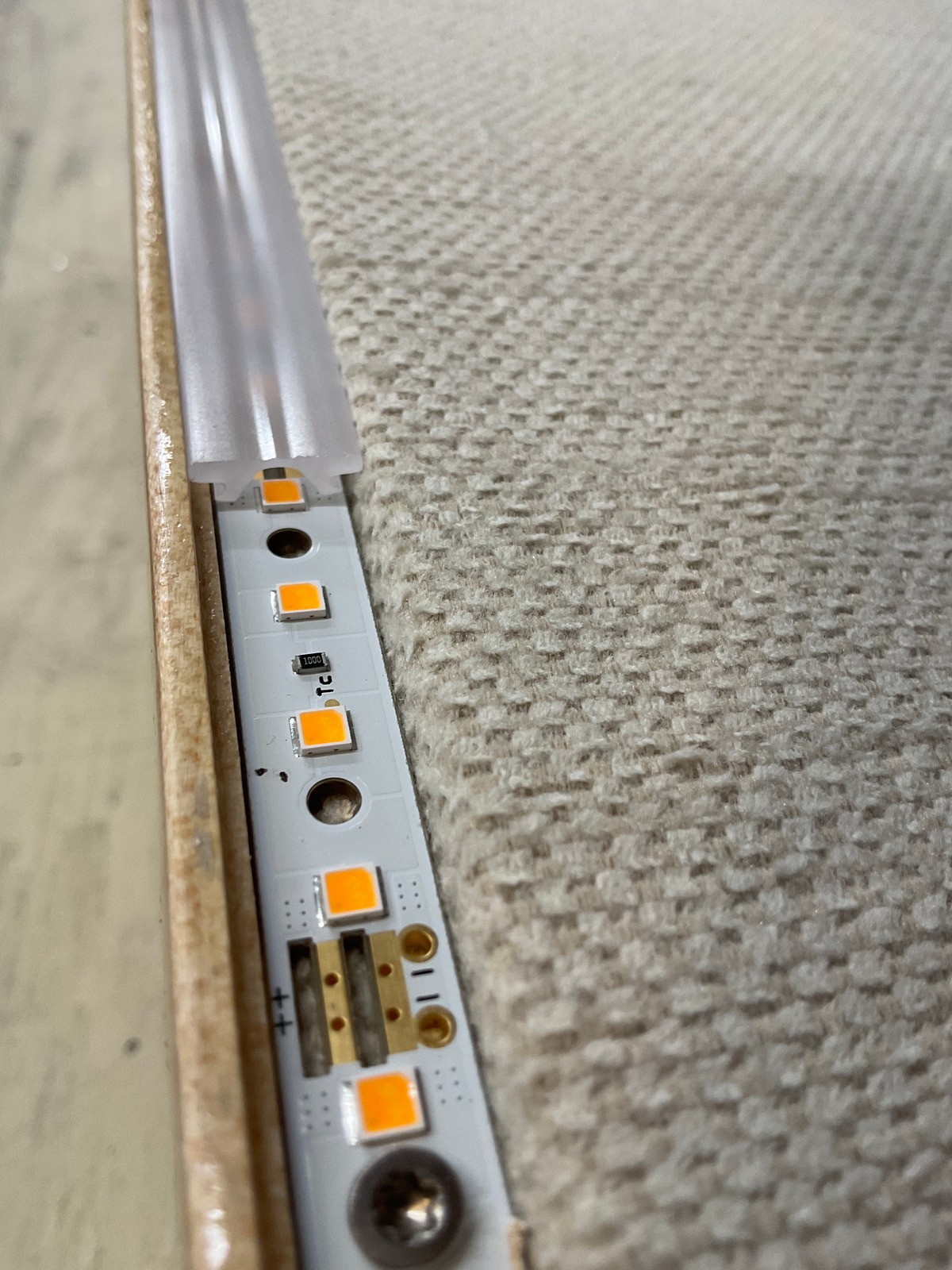 Die Rückseite des Bettgestells ist mit luftdurchlässigem Stoff bespannt, die Luft kann durch Öffnungen im Boden zwischen den Federn ausgetauscht werden. Die Sichtseiten sind mit lackiertem Furnier beklebt, eine Holzleiste an der Unterseite wurde eingefräst, um die Tischbeleuchtung bündig darin zu versenken und einen schönen Stoffabschluss zu bekommen. Die Streustreifen wurden bündig eingeklebt.