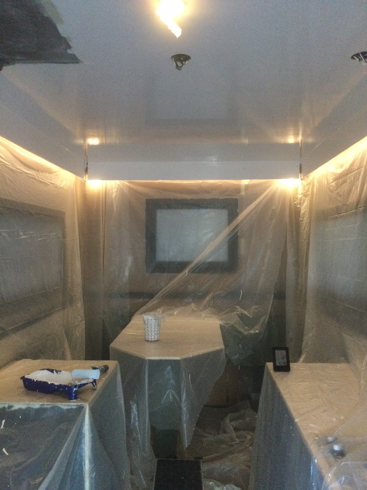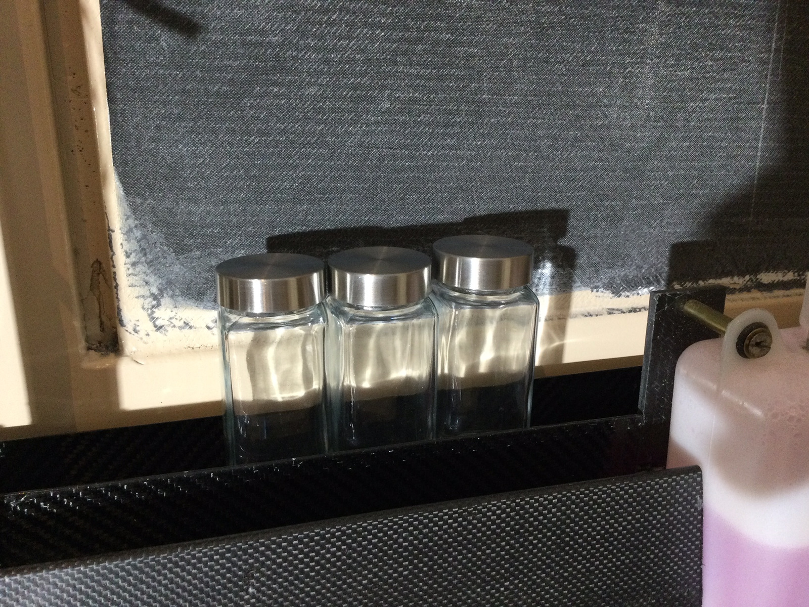 Dann ist auf Wunsch einer einzelnen Dame, die sich vor zwei Jahren für eine beigeähnliche Deckenfarbe entschieden hat, die Decke mit Weiss übergerollt. Und ich habe Gläser für Gewürze gefunden, die genau in die Krimskramsrinne passen. Der Spiegel mit den sandgestrahlten Seiten wartet auf den Einbau, wenn dann endlich mal die tageslichtweissen LED-Streifen kommen. Wird Zeit, dass die letzte schwarze Fläche verschwindet. Die Praxistauglichkeit des Tisches wurde erneut bestätigt.
