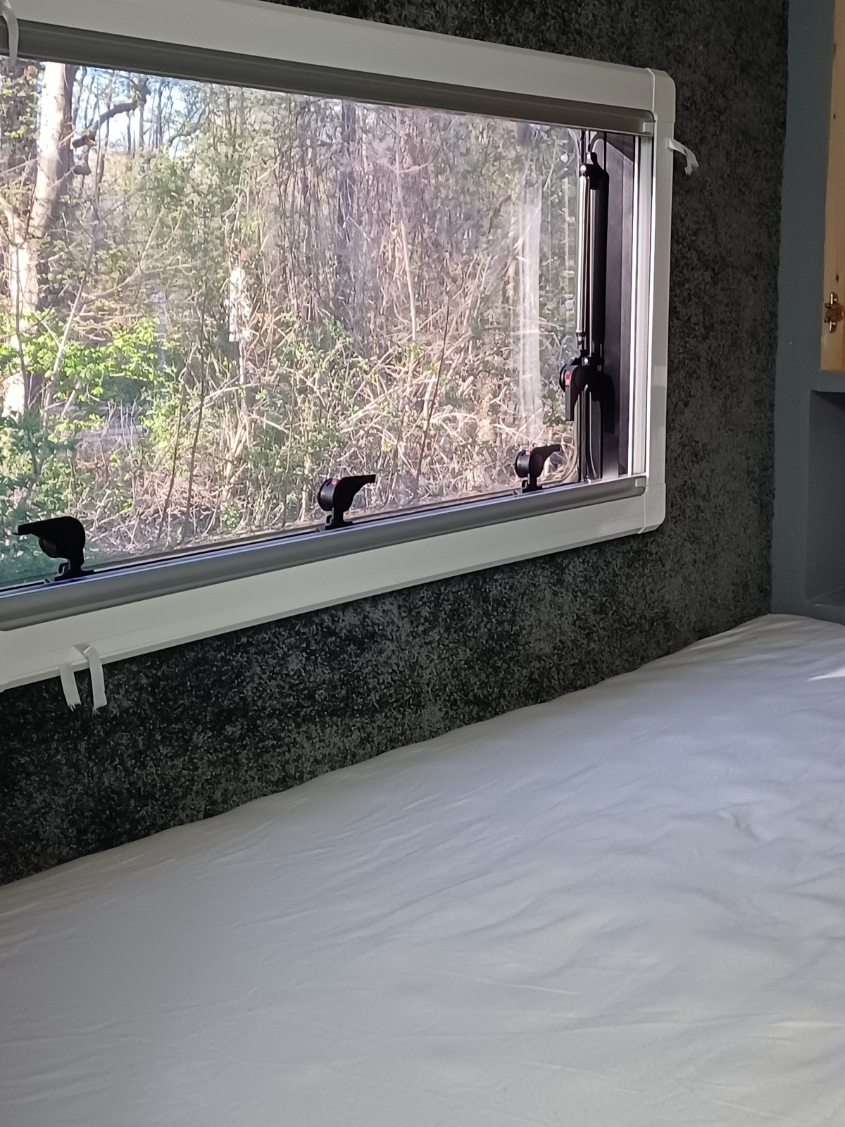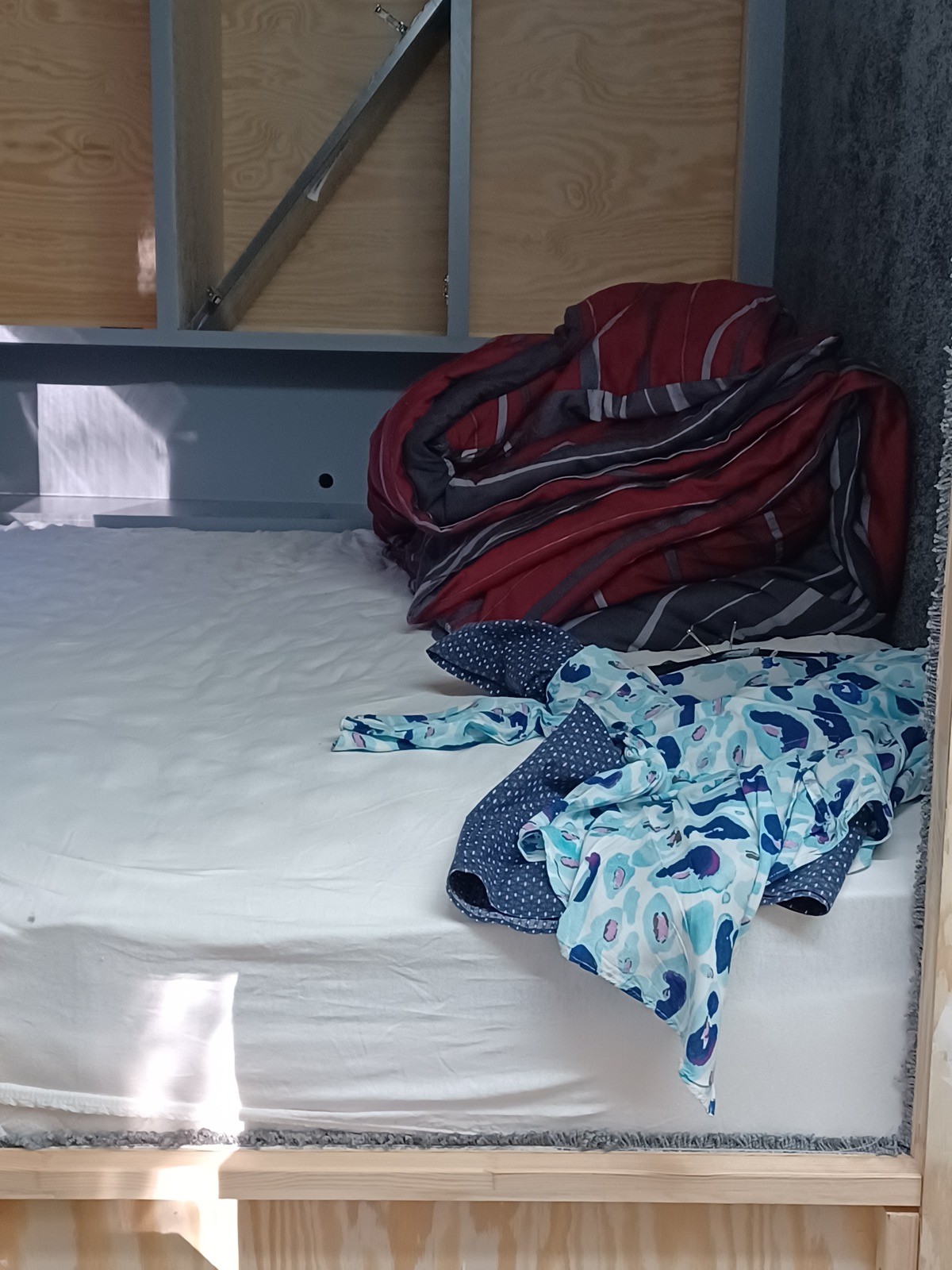 am Freitag noch die Matratze rein (Kompressor liegt vorerst lose unter dem Bett schnell das die Verdunkelung beim Bett montiert: