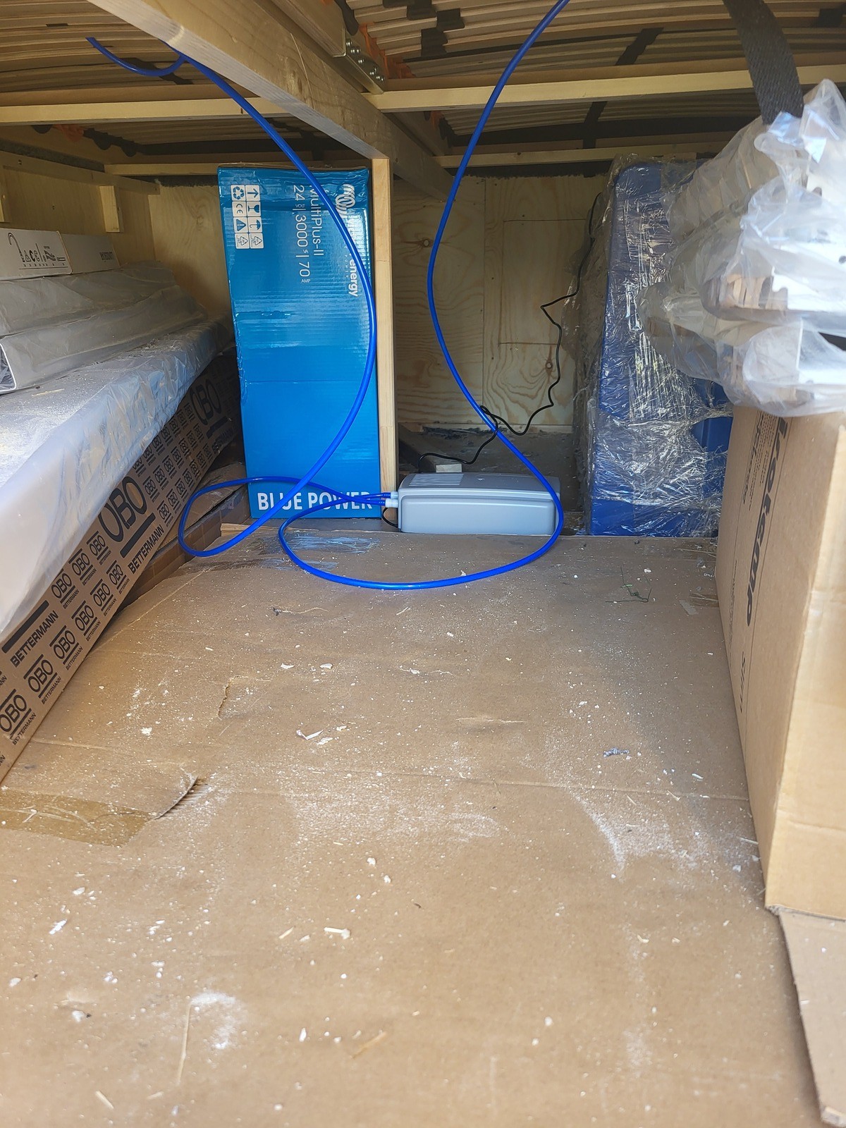 Nachdem seit Donnerstag der erste kleine Wechselrichter die Versorgung der Baubeleuchtung, des WCs und des Bettes übernimmt,