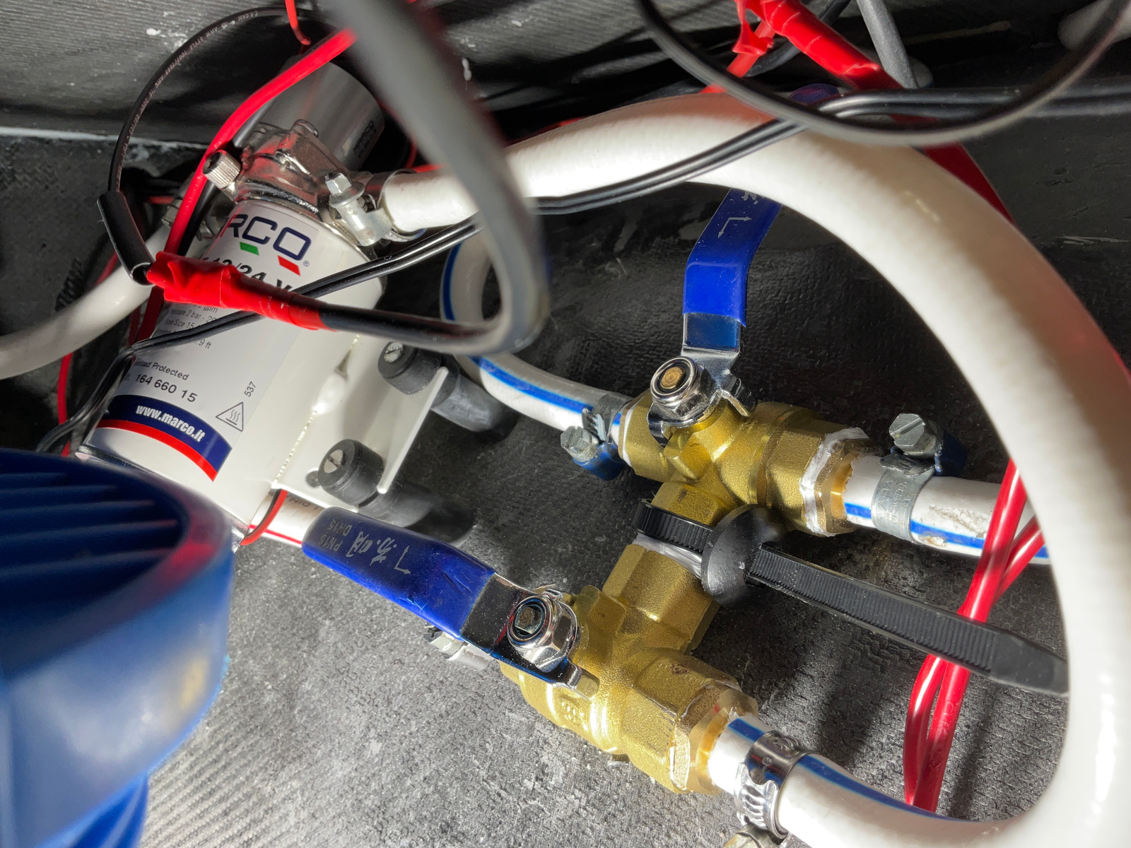 Die Kaltwasserleitung teilt sich auf und geht kalt direkt zum Wasserhahn und für warm durch den Alde-Kessel. An der tiefsten Stelle ist ein Ablassventil eingebaut, damit kann ich vom UV-Filter über den Kessel die komplette Wasserinstallation entleeren. Mit Entfernen der Filter läuft die Pumpe mit den Umschaltventilen leer.
