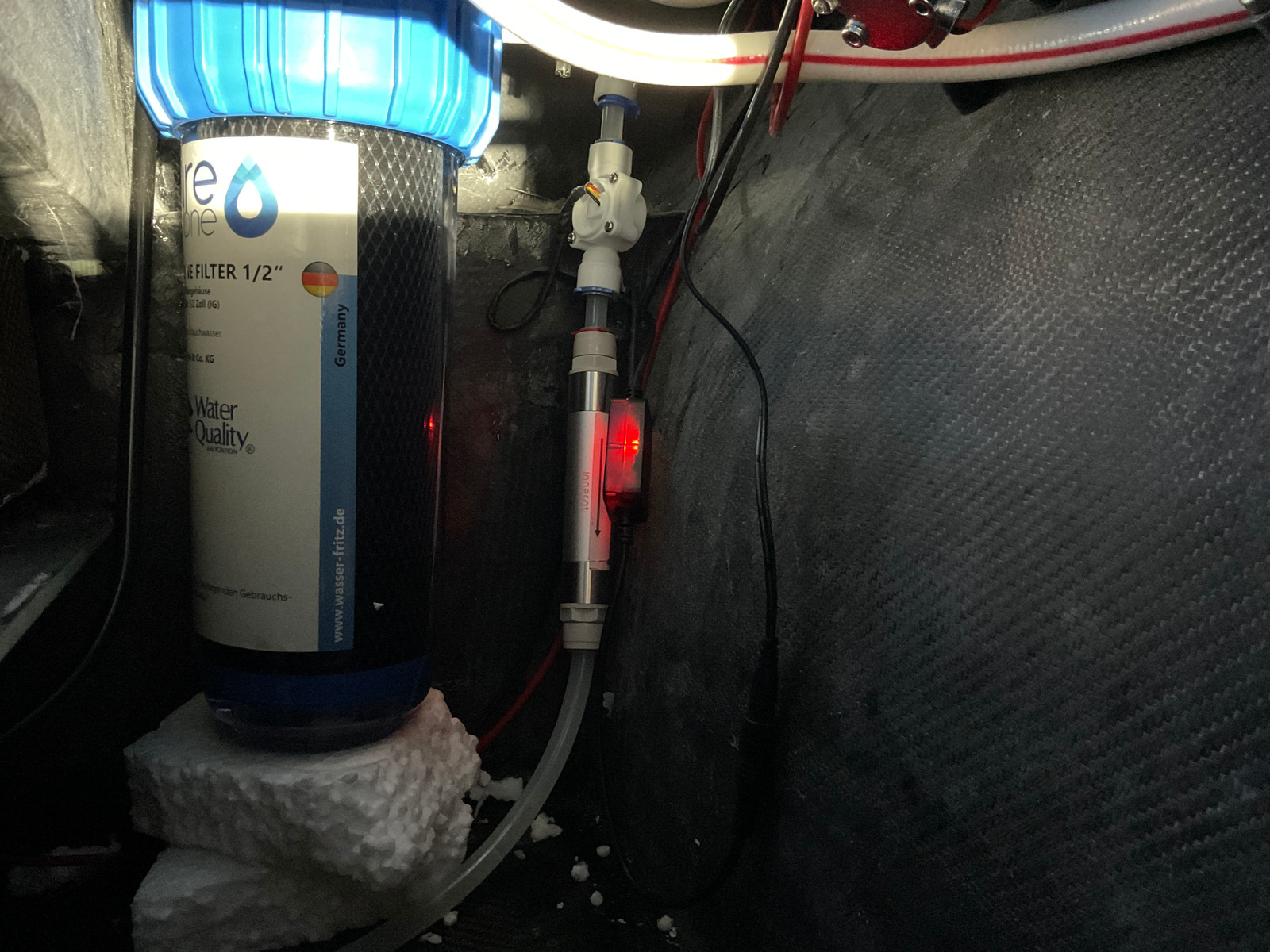 Die Zahnradpumpe hat einen eingebauten Drucksensor und liefert konstant 2 bar. Damit geht es durch einen Aktivkohlefilter und eine UV-LED-Desinfizierer. Die Filter stehen erst einmal auf Styroporklötzen, da ich den oberen Haltern nicht traue. In Arbeit sind Kohlefaserummantelte Schaumklötze mit Antirutschmattenstreifen.