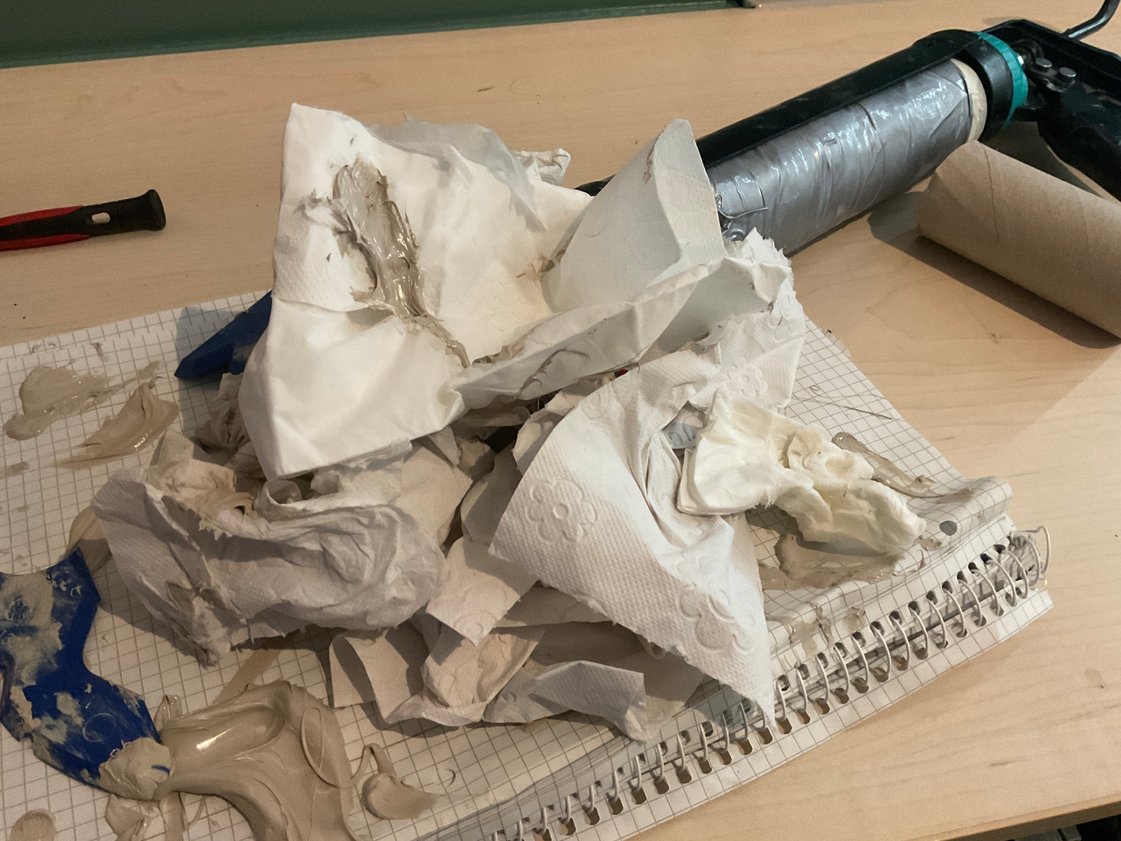 Die Silikonfuge in der Küche wurde aufwändiger, da die Kartusche längs aufgerissen ist und nach der Reparatur mit Gewebeklebeband der Deckel abgerissen ist. Ich habe mich dann manuell in dem Häufchen bedient und eine Fuge gebastelt