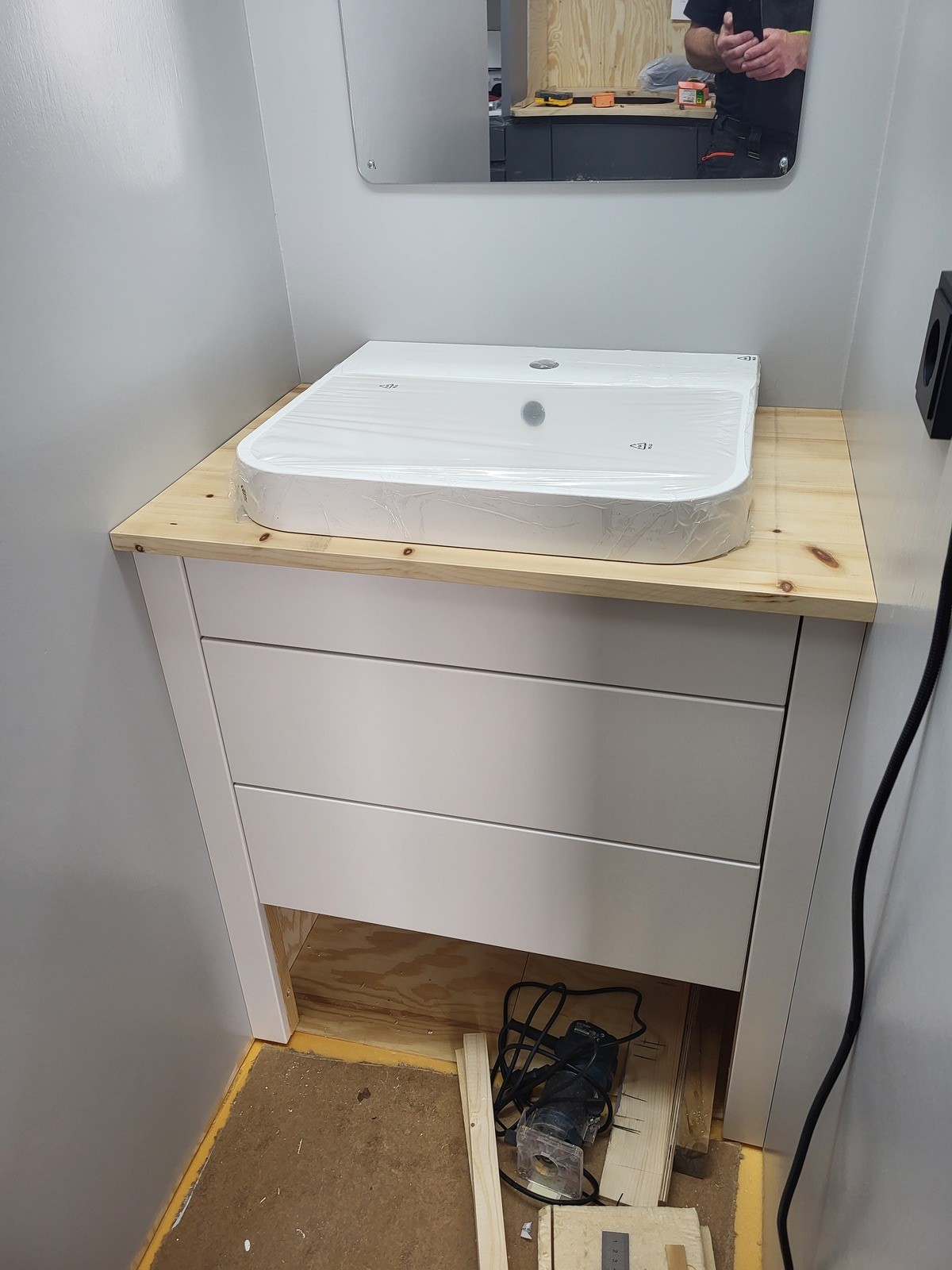 Der Abfluss liegt auch bereits vorbereitet im Schrank und muss am Abwassertank unterm Bett angeschlossen werden.