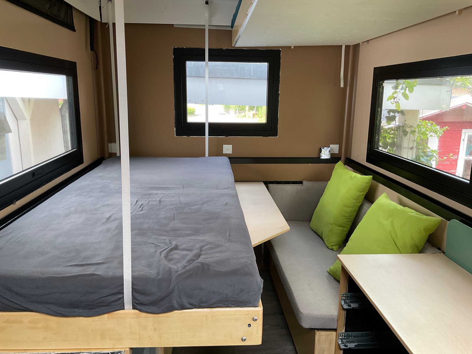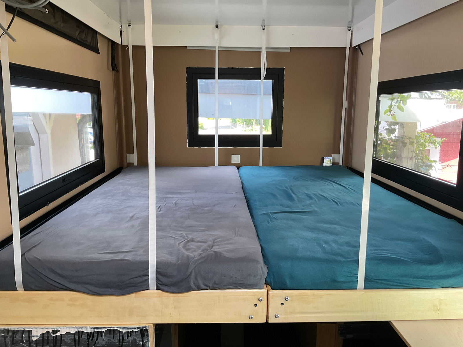 Die Justage in der oberen Endlage muss noch erfogen und ist kniffelig, weil unterschiedliche Belastungen auf den Gurten sind. Eine einheitliche, massgeschneiderte Bettwäsche ist ebenfalls in Arbeit.