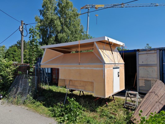 Beim raus tragen hatte sich das Dach ungeplant geöffnet und einer der Träger hat wohl am Dach gezogen, sodass ein Band gerissen ist. Mühselig zu flicken. Aber geht wieder. Jetzt stehen ein paar Restarbeiten an, und dann wird lackiert. Eine Schönheit wird es wohl nicht werden, aber praktikabel wird es sein.